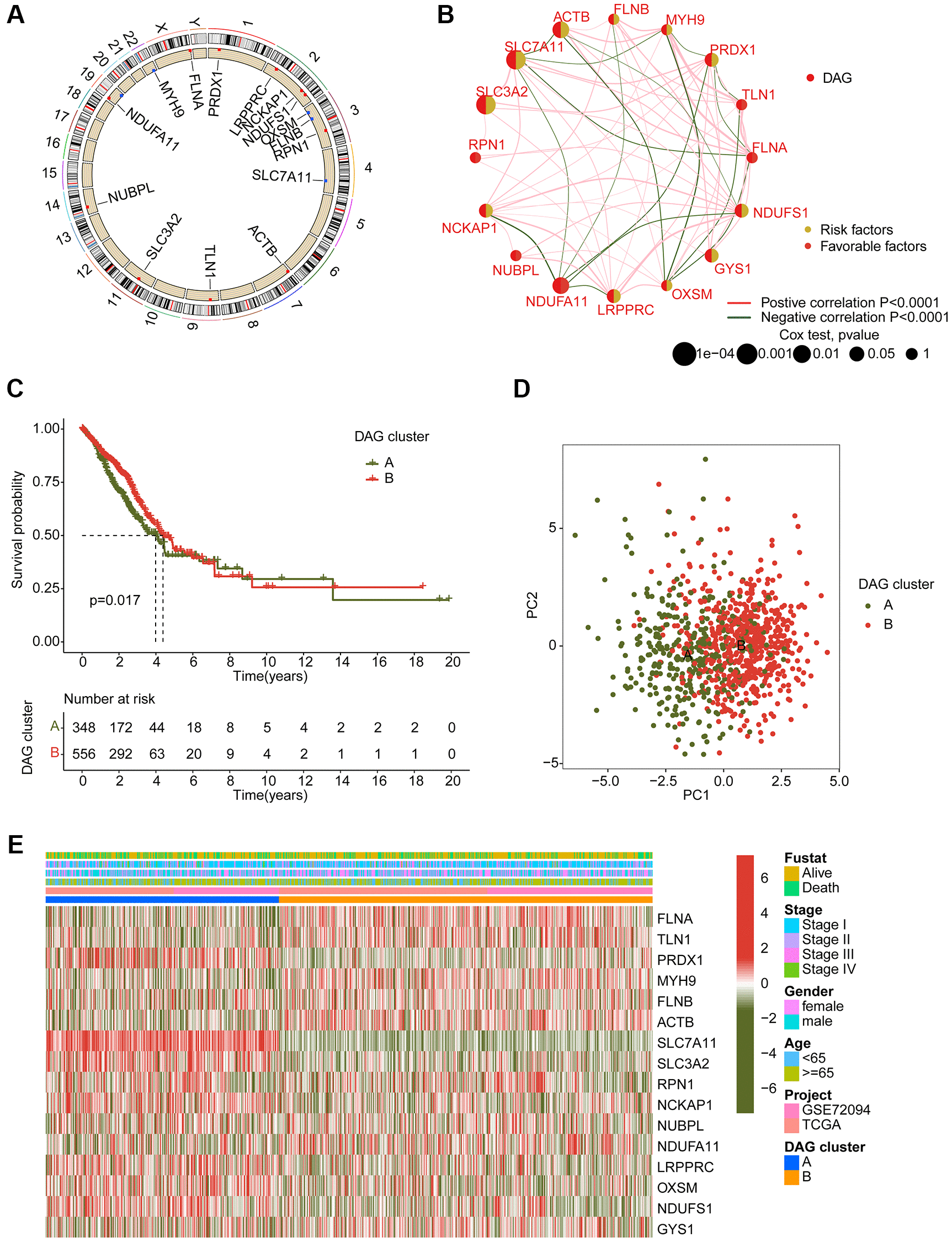 Figure 2. Generation of DAG-based molecular subtypes. (A) Location of DAG in chromosome. (B) Analysis of correlation and prognostic value of DAG in LUAD. (C) Clinical survival prognosis curve. (D) Unsupervised PCA of LUAD samples in DAG-based molecular subtypes. (E) Relationship of DAG expression and clinical variables (survival status, age, stage and gender) in DAG-based molecular subtypes.