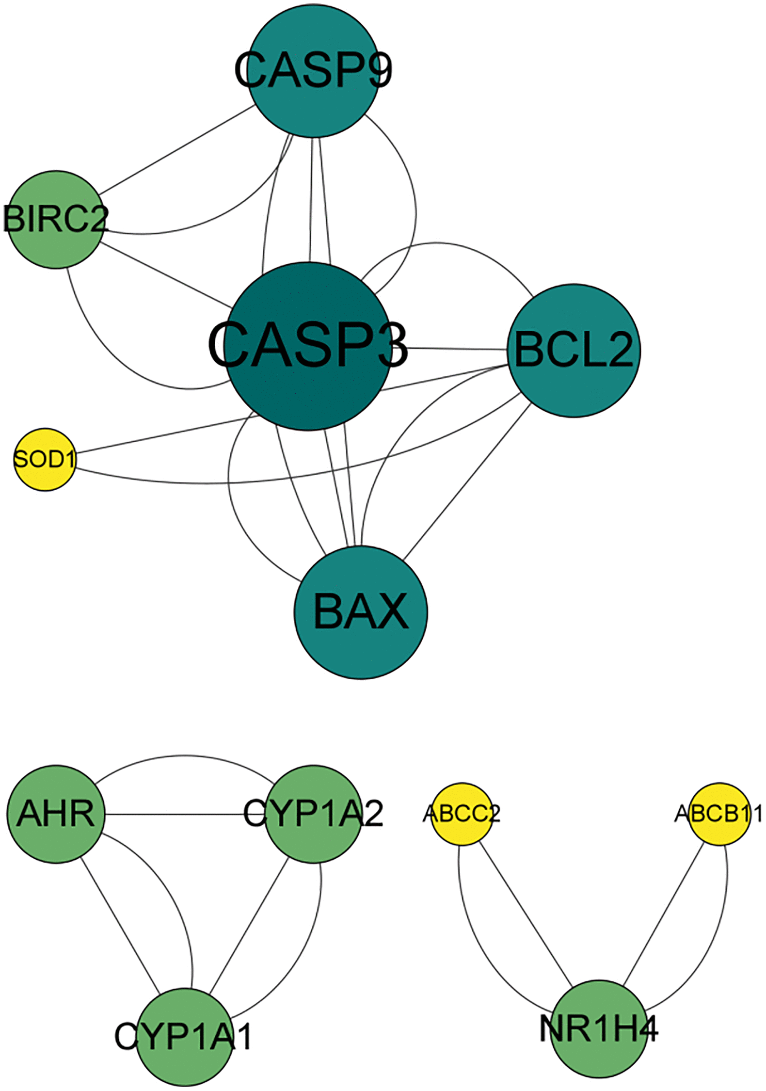 Figure 3. PPI network of the effects of angelicin in the treatment of osteosarcoma. The nodes represent potential therapeutic targets of angelicin in the treatment of osteosarcoma. The larger the node, the darker the color, the higher the target degree, and the higher the number of connections with other nodes.