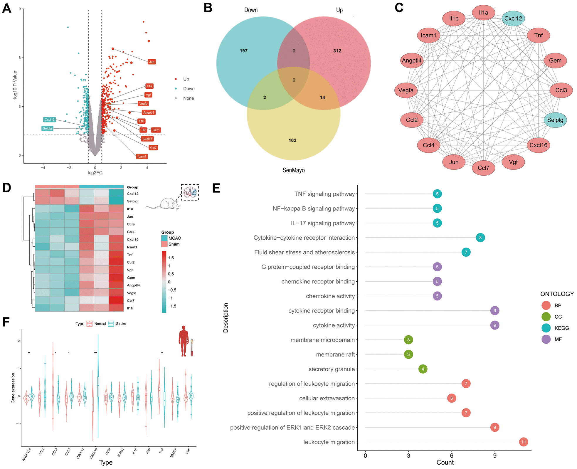 Figure 2. Discovery of SRGs in rat MCAO model and human peripheral blood. (A) The volcano plot for DEGs of brain tissue in GSE163654. The genes related to cellular senescence were labeled. Red represents high gene expression and blue represents low expression. (B) The Venn plot for the distribution of DEGs. (C) The protein-protein interaction network for SRGs. (D) The heatmap for SRGs in GSE163654. (E) GO/KEGG pathway analysis and protein interaction network of SRGs. The color of the proteins corresponds to the pathway and the number shows the count of genes. (F) The violin plot for SRGs of human peripheral blood in GSE16561. *p < 0.05, **p < 0.01, ***p < 0.001.