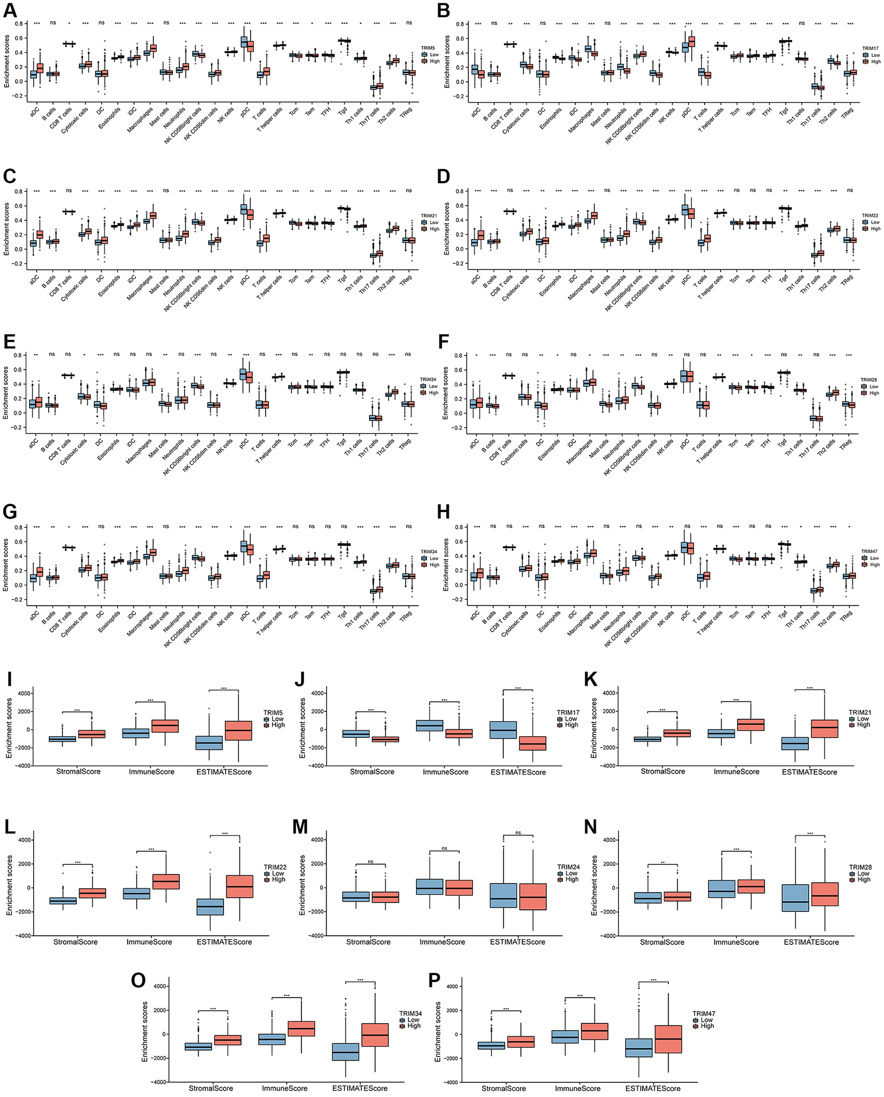 Figure 10. Immune infiltration landscapes of TRIM molecular family in gliomas. Correlation between TRIM family members' expression and 24 tumor-infiltrating immune cell types (A–H). Distribution of stromal score, immune score and ESTIMATE score in high- versus low-TRIM family expression groups (I–P). ns, p ≥ 0.05; *p < 0.05; **p < 0.01; ***p < 0.001.