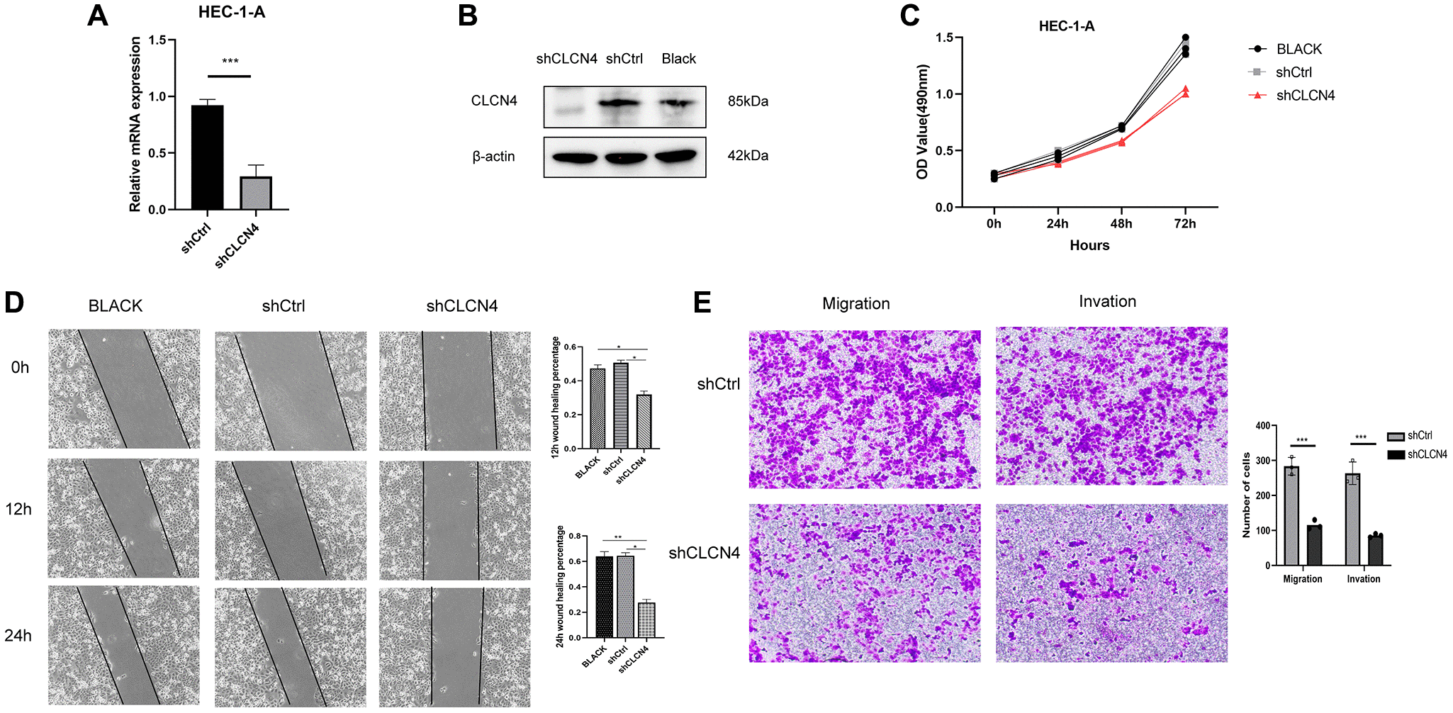 Figure 14. Knockdown of CLCN4 inhabit the proliferation of HEC-1-A cells. (A, B) qPCR and western blotting were used to verify the knockdown efficiency of shCLCN4. ***p < 0.001 (C) Growth curve was used to measure the effect of shCLCN4 on the proliferation of HEC-1-A cells by CCK8. (D) Wound healing of HEC-1-A cells between the BLCAK, shCtrl, shCLCN4 groups. *p < 0.05, **p < 0.01, ***p < 0.001. (E) Cell migration and migration of HEC-1-A cells between the shCtrl, shCLCN4 groups. ***p < 0.001.