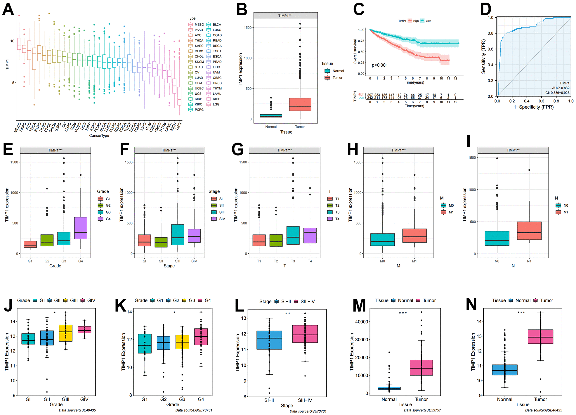 Figure 6. Correlation of TIMP1 expression profile with clinicopathological characteristics in ccRCC. (A) Expression profile of TIMP1 in 33 tumors; (B) Differential expression of TIMP1 in ccRCC and paracancerous tissues; (C) KM survival curves showing OS of TIMP1 in ccRCC; (D) ROC curves about TIMP1 in ccRCC; (E–I) Differences in TIMP1 expression profile among clinicopathological variables (E) Grade; (F) Stage; (G) T stage; (H) M stage; (I) N stage; (J–N) Differential expression of TIMP1 in different clinicopathological stages in the GEO validation datasets. (J, N) GSE40435; (K, L) GSE73731; (M) GSE53757.