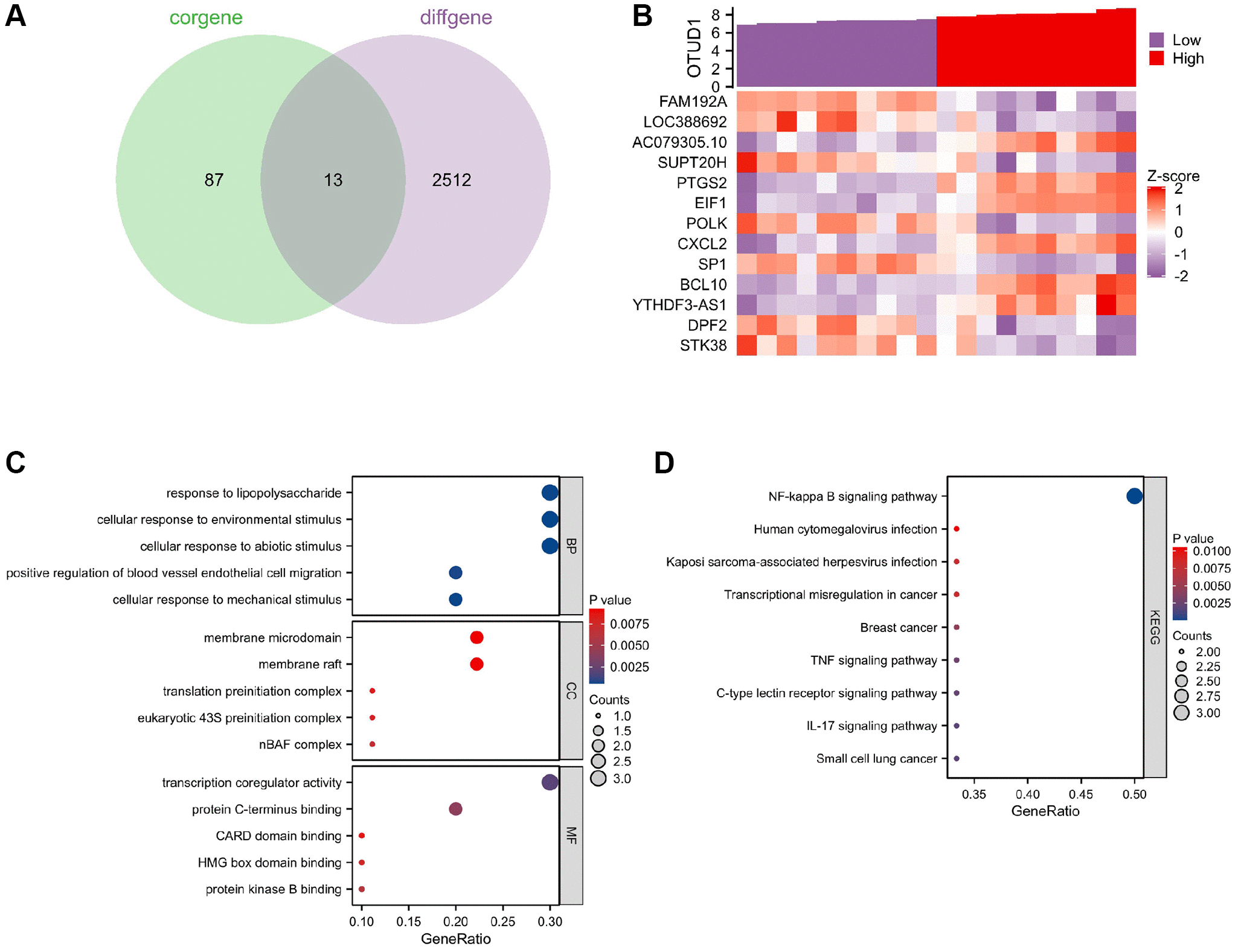 Figure 7. Key gene selection for herpesvirus latency-mediated stroke occurrence. (A) Venn diagram of the intersection of the top 100 positively and negatively correlated genes with OTUD1 in the GSE22255 dataset and differentially expressed genes in stroke. (B) Co-expression heatmap of OTUD1 and 13 intersection genes. The Z-score transformation reduces the visualization effects of large differences in expression values between different variables and preserves differences in expression of individual variables between samples. (C) GO functional enrichment analysis of the 14 genes. (D) KEGG pathway enrichment analysis of the 14 genes.