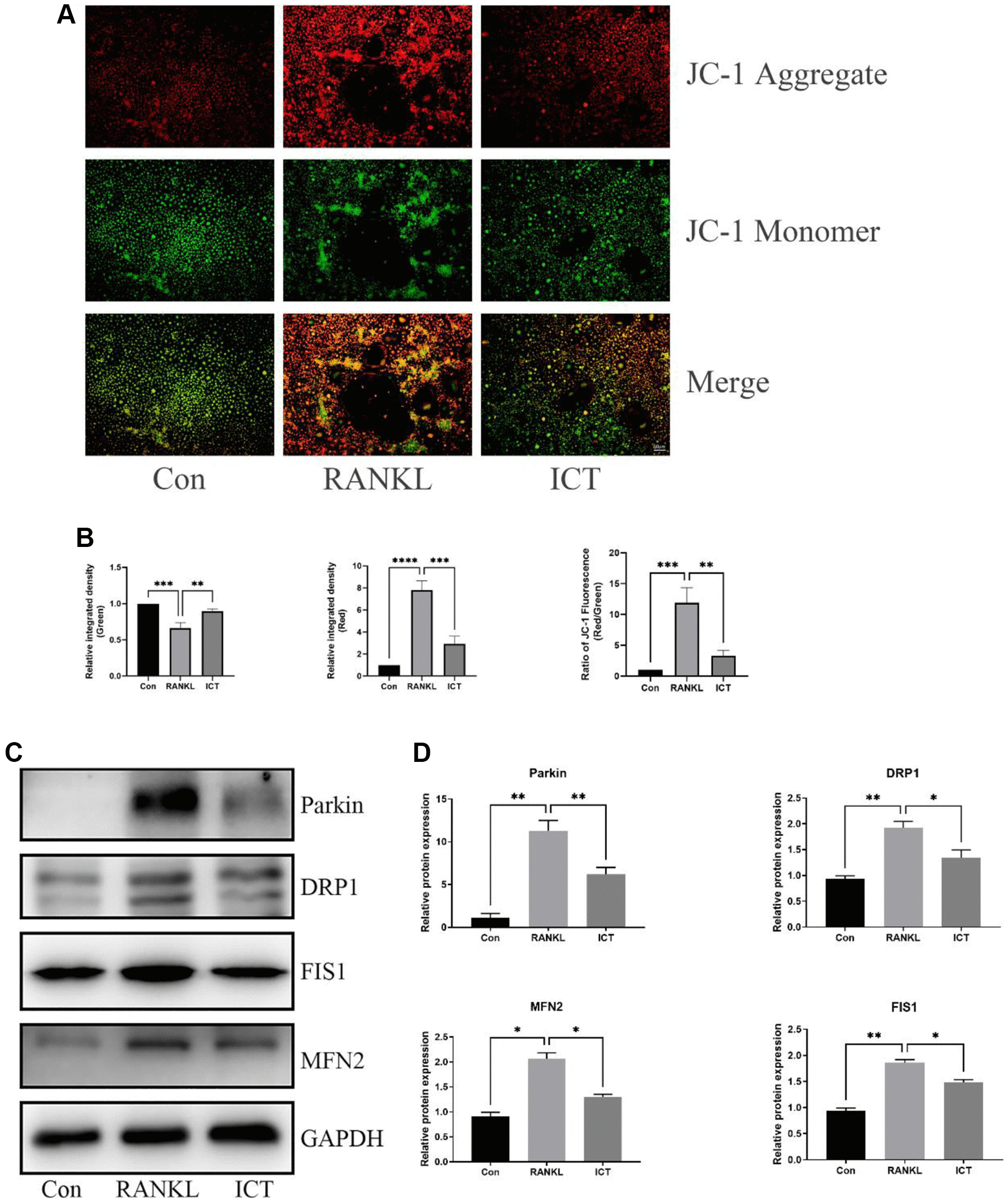 Figure 6. ICT inhibited the mitochondrial membrane potential and reduced mitochondrial fusion and fission. (A) Representative fluorescence photographs of mitochondrial membrane potential stained by JC-1. (B) Quantitative analysis of membrane potential by measuring the ratio of red and green fluorescence intensity. (C) Representative protein bands of Parkin, DRP1, FIS1, and MFN2. (D) Quantitative analysis of Parkin, DRP1, FIS1, and MFN2. All data were presented as mean ± SD, n = 3, *P < 0.05; **P < 0.01; ***P < 0.001; ****P < 0.0001.