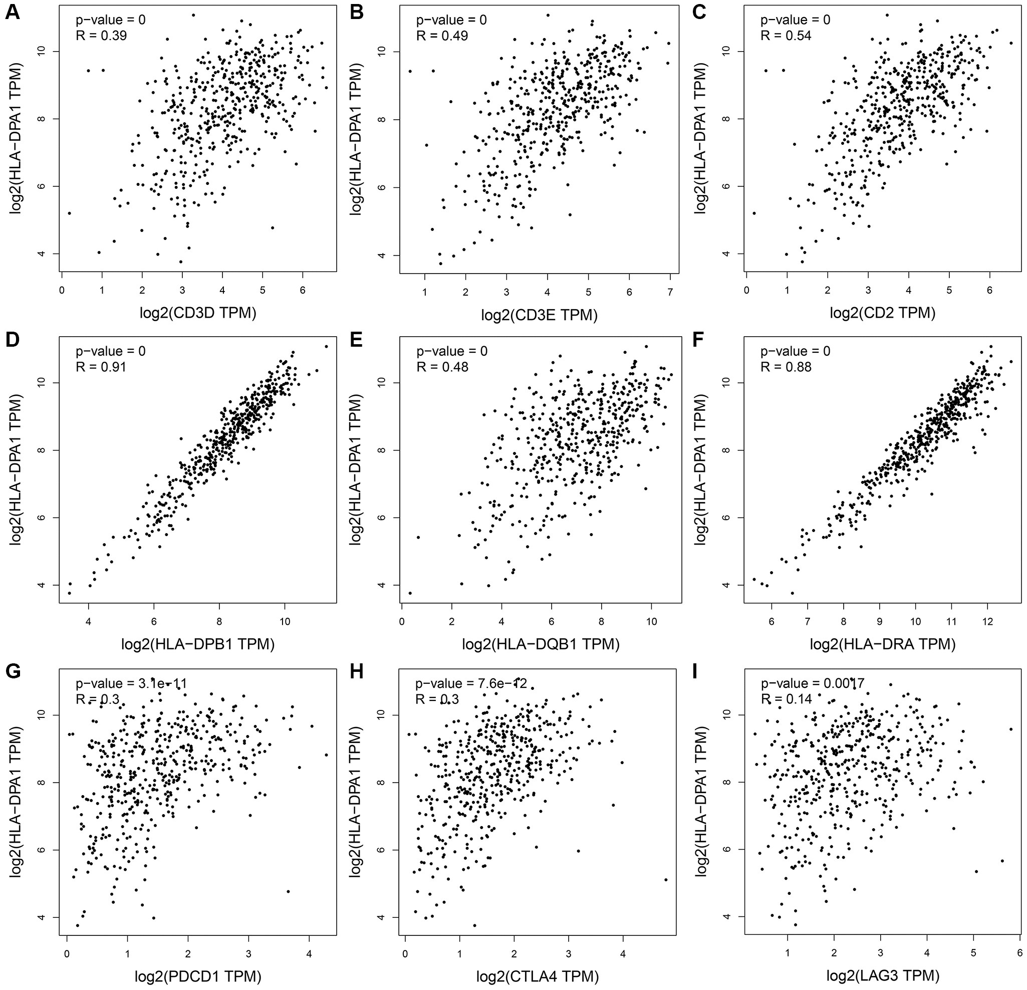 Figure 13. The association between the HLA-DPA1 overexpression and immune cell markers in LUAD using the GEPIA database. (A) CD3D; (B) CD3E; (C) CD2; (D) HLA-DPB1; (E) HLA-DQB1; (F) HLA-DRA; (G) PDCD1; (H) CTLA4; (I) LAG3. Abbreviation: LUAD: lung adenocarcinoma.