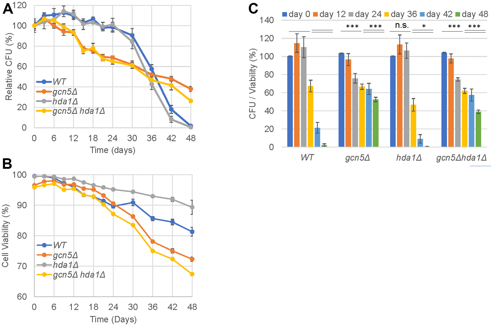 Figure 3. Gcn5 displays contradictory roles in the regulation of chronological lifespan. (A) Relative CFU; (B) Cell viability; (C) Normalised CFU to cell viability. Two-factor ANOVA analysis was conducted to reveal the significance of differences across the indicated timepoints. ***: p < 0.001, **: 0.001<p< 0.01, *: 0.01<p< 0.05 and n.s.: p> 0.05.
