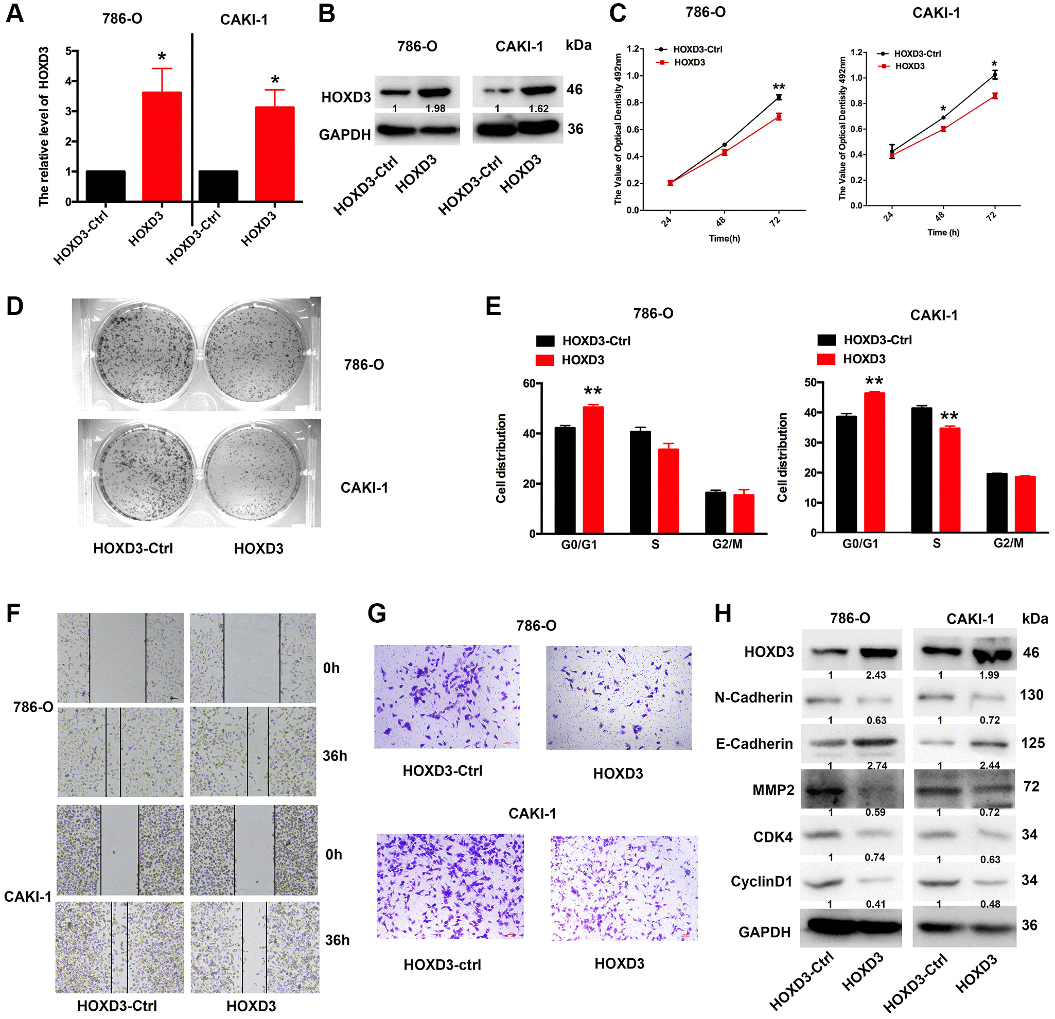 Figure 5. HOXD3 overexpression inhibits proliferation in ccRCC cells. (A, B) The expression level of HOXD3 at mRNA and protein levels was assessed by qRT-PCR and western blotting when 786-O and CAKI-1 cells were transfected with HOXD3-Ctrl and HOXD3. (C) The cell viability of ccRCC cells was examined by MTT assay at 24 h, 48 h, and 72 h. (D) Clone formation assay was used to test the colonies number of 786-O and CAKI-1 cells which were transfected with HOXD3-Ctrl and HOXD3. (E) Cell cycles were determined in 786-0 and CAKI-1 cells after transfection of the HOXD3 overexpression vector or HOXD3-Ctrl. The histogram indicates the percentage of cells at G0/G1, S, and G2/M cell-cycle phases. (F, G) The wound healing and transwell assays were applied for verifying the migration and invasion ability of HOXD3 and control-transfected human ccRCC. Scale bar, 100 μm. (H) The expression of N-cadherin, E-Cadherin, MMP2, CDK4, and CyclinD1 was demonstrated by western blotting in both 786-O and CAKI-1 cells of HOXD3 overexpression (p < 0.01).