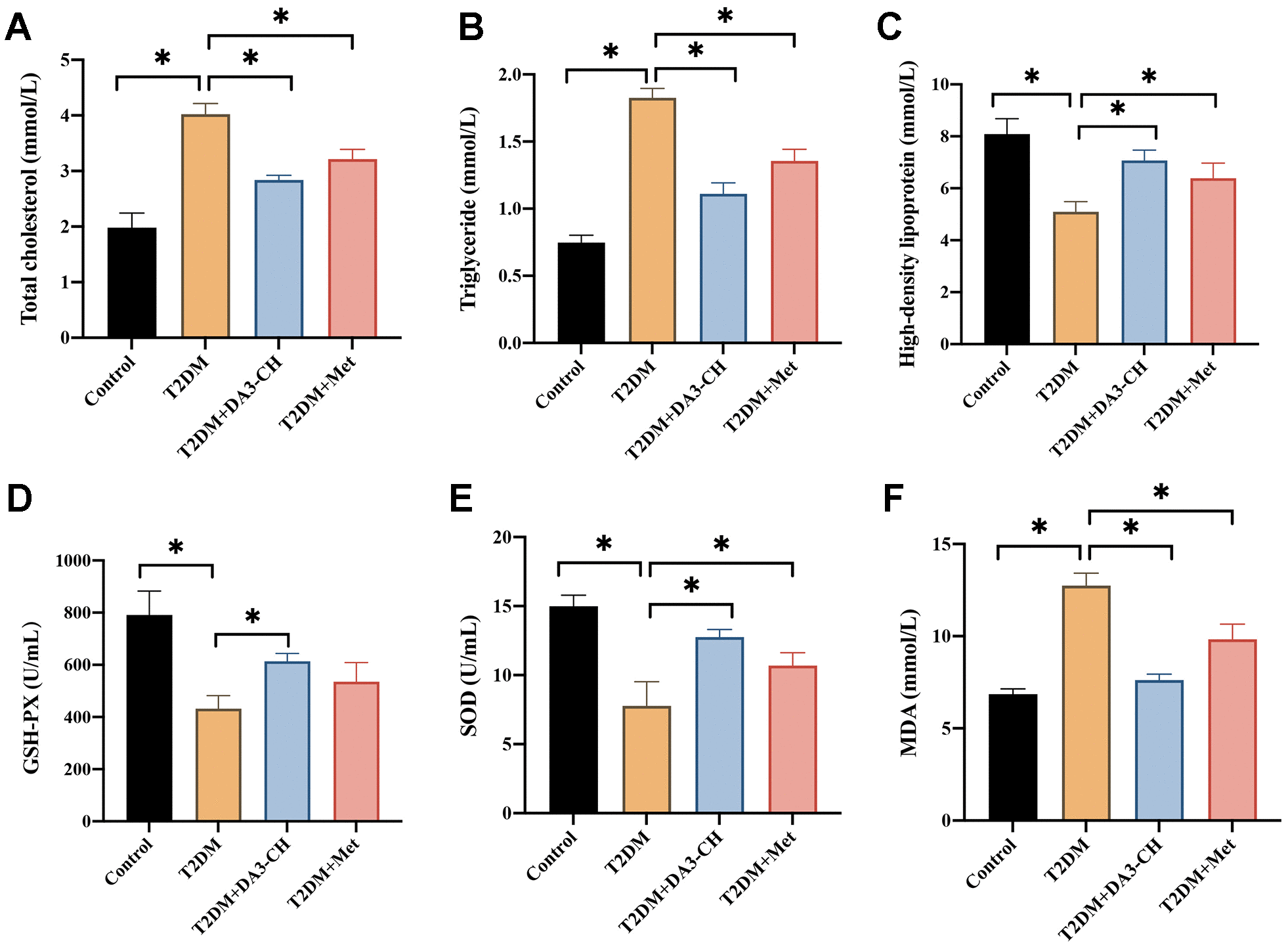Figure 3. DA3-CH markedly inhibited the blood fat levels and oxidative stress condition of T2DM rats. (A) The total cholesterol level in the serum was measured; (B) The triglyceride level in the serum was measured; (C) The high-density lipoprotein in the serum was measured; (D) The GSH-PX level in the serum was measured; (E) The SOD level in the serum was measured; (F) The MDA level in the serum was measured. * means p <0.05. n=3 for each group.