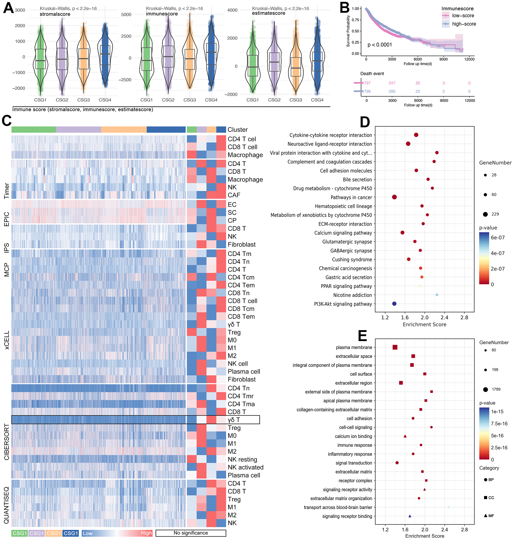Figure 7. Tumor immunity and pathway features of CRG subgroups. (A) Stormalscore, immunescore, and estimatescore are predicted in R4.2.0. (B) K-M analysis showed the effect of immunescore on prognosis in pan-cancer. (C) Immune cell infiltration in CRG subgroups, including innate immunity and adjust immunity. (D) KEEG and (E) GO analysis showed CRG-related-genes-related molecular pathways.