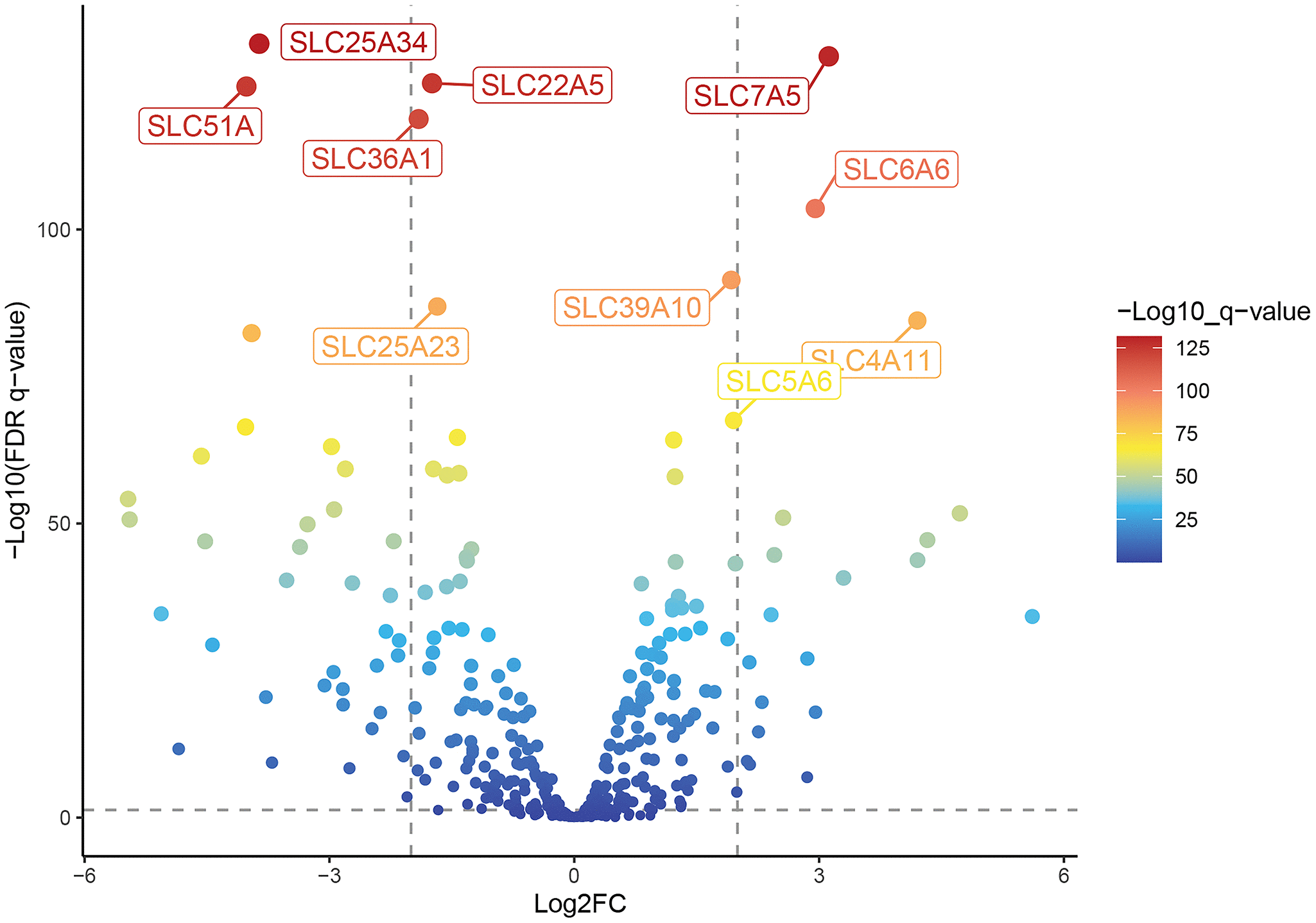 Figure 1. Difference analysis of the human solute carrier (SLC) gene family between tumor tissue and adjacent normal tissue in patients with colorectal cancer. The volcano map of 224 differentially expressed SLC family genes in colorectal cancer compared with normal tissues shows the top 5 up-regulated and down-regulated genes respectively.