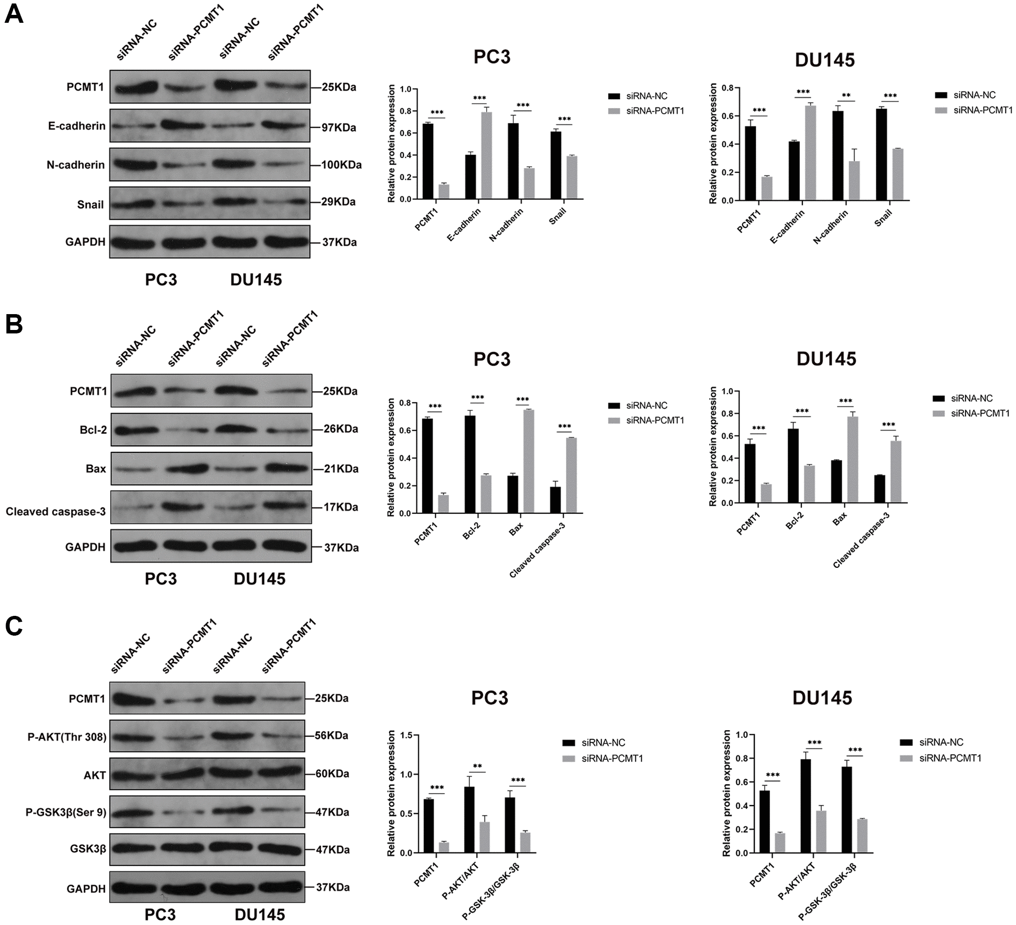 Figure 5. PCMT1 regulates the EMT and apoptosis of PCa cells by modulating the PI3K/AKT/GSK-β signaling pathway. (A) Protein expression of factors involved in EMT, and quantification of the protein levels. (B) Protein expression of factors involved in apoptosis, and quantification of the protein levels. (C) Protein expression of P-AKT, AKT, P-GSK-3β, and GSK-3β, and quantification of the protein levels. Data are expressed as mean ± SD of at least three experiments. **P < 0. 01, ***P < 0. 001.