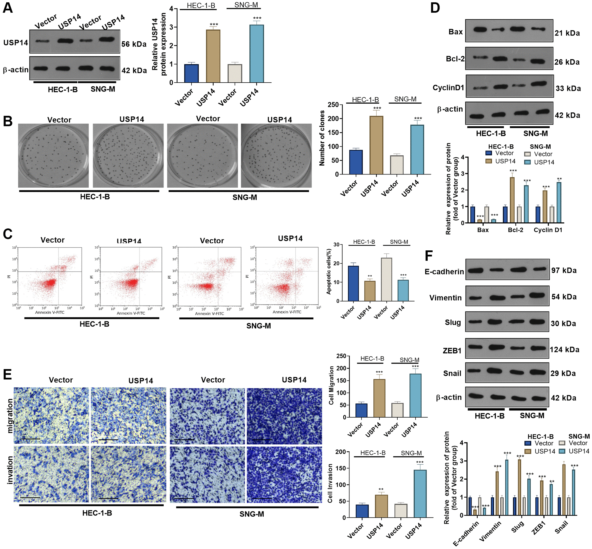 Figure 2. The functions of USP14 in mediating the apoptosis, migration and invasion of EC cells. (A) USP14 overexpression plasmids were transfected into HUC-1-B and SNG-M cells, and the USP14 profile in EC cell lines was examined via WB. (B) Colony formation of HEC-1-B and SNG-M cells was observed through colony formation experiments. (C) FCM verified apoptosis. (D) Bcl-2, Bax, and Cyclin D1 profiles were examined through WB. (E) Transwell assays were used to evaluate EC cell migration and invasion. (F) E-cadherin, Vimentin, Snail1, ZEB1 and Slug profiles were examined by WB. **, ***represent P < 0.01, and P < 0.001, respectively. N = 3.