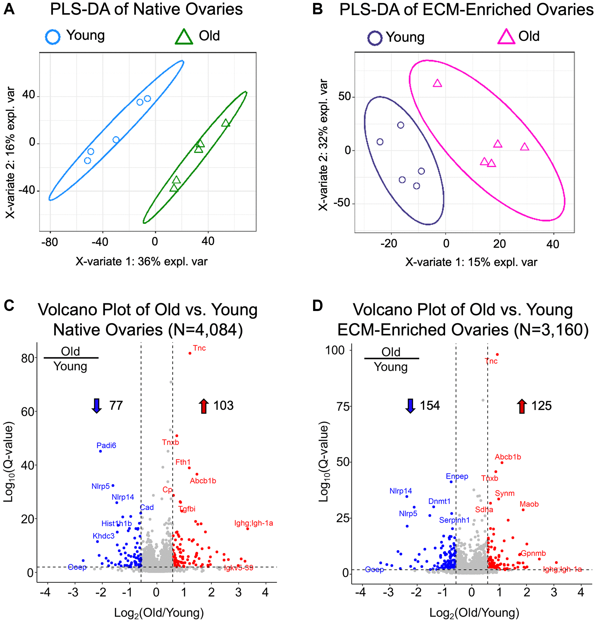 Figure 5. Native and ECM-enriched ovaries have distinct age-associated proteomic signatures. (A, B) Partial least squares-discriminant analysis performed with quantifiable proteins from native (A, N = 4,084) and ECM-enriched (B, N = 3,160) ovaries shows distinct, age-dependent clustering in both native and ECM-enriched conditions. (C, D) Volcano plots of significantly altered proteins comparing (C) old vs. young native ovaries (N = 180) and (D) old vs. young ECM-enriched ovaries (N = 279). In native ovaries, 103 proteins are significantly upregulated and 77 proteins are significantly downregulated with age. In ECM-enriched ovaries, 125 proteins are significantly upregulated and 154 proteins are significantly downregulated with age. Filtering criteria to determine significantly altered proteins are as follows: q-value < 0.01 and |log2(Old/Young)| > 0.58.