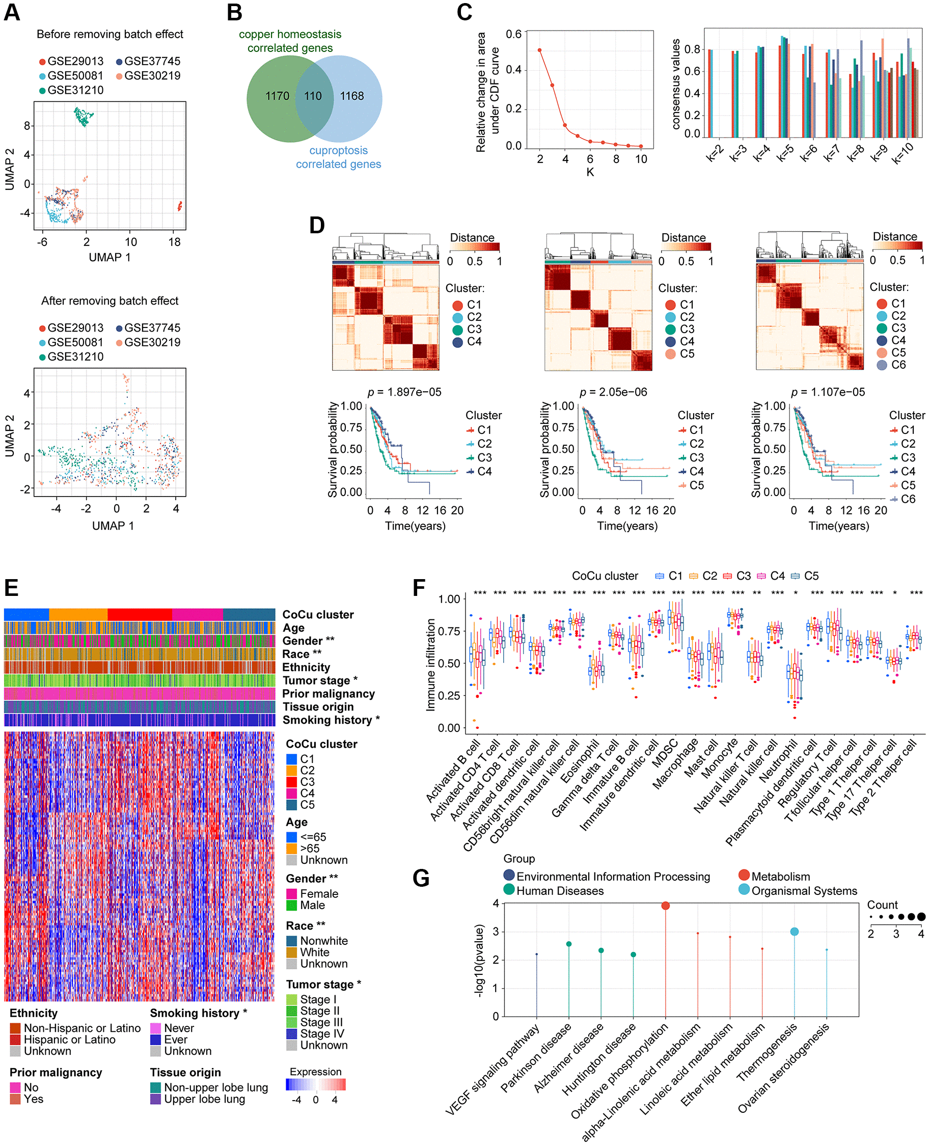Figure 2. Removal of batch effects for the validation cohort and construction of the CoCu cluster. (A) The validation cohort is visually compared before and after the elimination of batch effects. The UMAP plot displayed at the top depicts the combined state of the GEO dataset before removing the batch effect. Conversely, the UMAP plot in the lower section illustrates that after removing the batch effect from the merged dataset, the samples are interwoven, providing proof of the effectiveness of batch effect removal. (B) 110 genes that correlate to both copper homeostasis and cuproptosis-regulated genes were identified using a Venn diagram. (C) CDF plot (left) showing the downward trend of the curve. Consensus plot (right) showing the consensus value at specific k value. (D) Based on the evidence provided from CDF and consensus plots, we were more interested in the clustering situation when k = 4, 5, and 6. Clustering diagrams (upper) for k = 4, 5, and 6. KM curves (lower) for each k value. (E) The heatmap depicts the correlation between CoCu clusters, clinical parameters, and 110 genes associated with copper homeostasis and cuproptosis. The asterisks indicate statistical differences between CoCu clusters. In the heatmap, each row corresponds to a specific gene, while each column corresponds to a particular sample. (F) The box plots illustrate notable variations in the distribution of all 23 immune cell types across the 5 CoCu clusters, indicating statistical significance. (G) KEGG that was performed using 72 CoCu-DEGs showing the top enriched pathways. CoCu clusters: clusters identified by copper homeostasis and cuproptosis correlated genes; CoCu-DEGs: differentially expressed genes identified among CoCu clusters; UMAP: Uniform Manifold Approximation and Projection; CDF: cumulative distribution function; KM: Kaplan–Meier estimator; DEGs: differentially expressed genes; KEGG: Kyoto Encyclopedia of Genes and Genomes; A statistically significant P-value was defined as being less than 0.05; The following notation was used: * for P-values less than 0.05, ** for P-values less than 0.01, and *** for P-values less than 0.001.