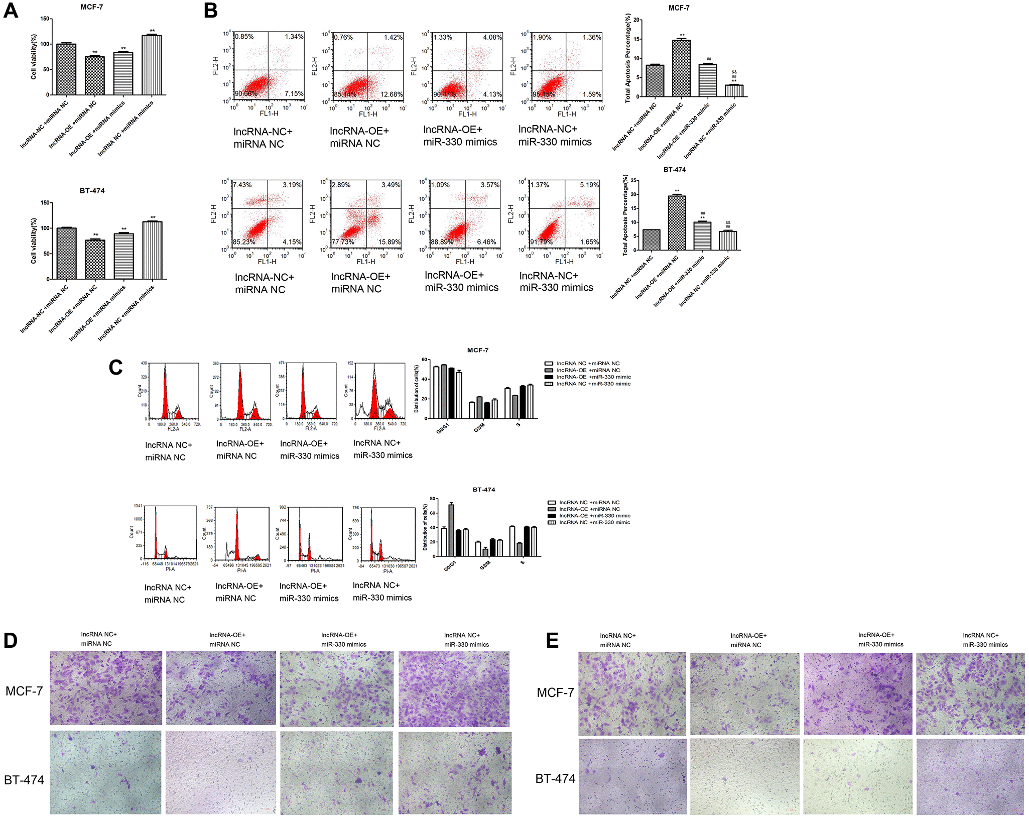 Figure 6. Overexpression of lncRNA MEG3 on cell viability, apoptosis, migration and invasion by regulating miR-330/CNN1. (A) Decrease in cell viability caused by lncRNA MEG3 overexpression was partly counteracted by miR-330 mimics. *P < 0.05, **P < 0.01 vs. lncRNA NC + miRNA NC; ##P < 0.01 vs. lncRNA-OE+ miRNA NC; &&P < 0.01 vs. lncRNA-OE + miRNA NC. (B) Effect of co-treatment of lncRNA MEG3 overexpression and miR-330 mimics on cell apoptosis. (C) Effect of co-treatment of lncRNA MEG3 overexpression and miR-330 mimics on cell cycle. **P < 0.01 vs. lncRNA NC + miRNA NC; ##P < 0.01 vs. lncRNA-OE + miRNA NC; &&P < 0.01 vs. lncRNA-OE + miRNA NC. (D) Effect of co-treatment of lncRNA MEG3 overexpression and miR-330 mimics on cell migration. (E) Effect of co-treatment of lncRNA MEG3 overexpression and miR-330 mimics on cell invasion (magnification, 200×).