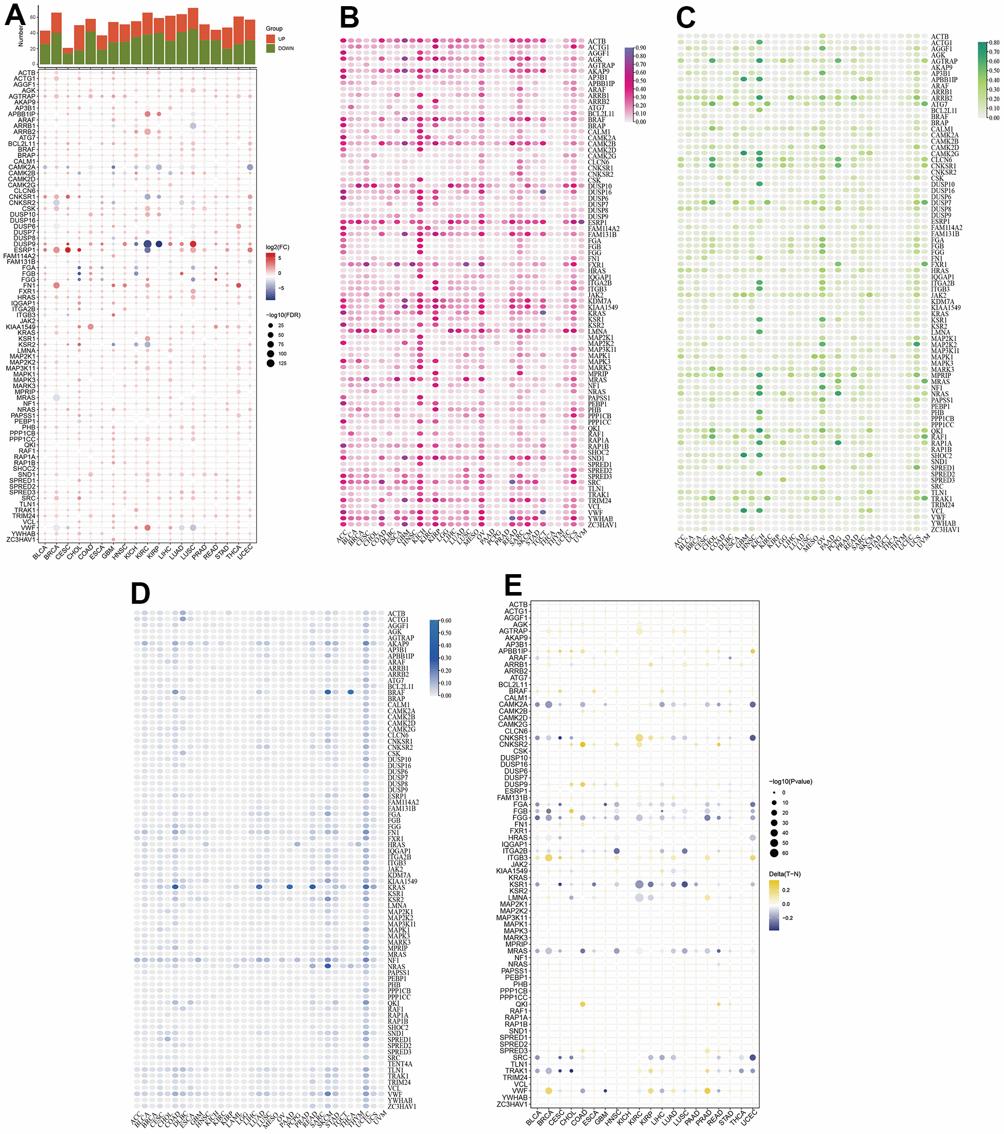Figure 1. Comprehensive assessment of MAPK pathway in pan-cancer. (A) mRNA expression of MAPK-related genes. (B) CNV gain of MAPK-related genes. (C) CNV loss of MAPK-related genes. (D) SNV frequency of MAPK-related genes. (E) DNA methylation of MAPK-related genes.