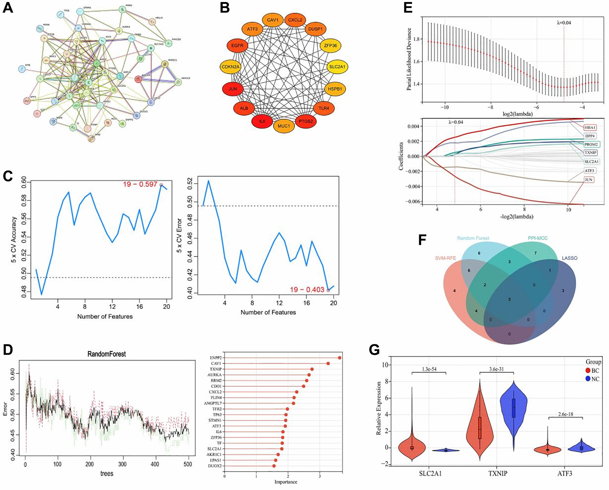 Figure 3. Screening of key ferroptosis-related genes in breast cancer. (A) Protein-protein interaction network of ferroptosis-related DEGs. (B) Top 20 genes with the best connectivity identified by the MCC algorithm. (C) SVM-REF analysis of the feature ferroptosis-related genes for differentiating breast cancer tissues from adjacent tissues. (D) Random forest analysis of the feature ferroptosis-related genes for differentiating breast cancer tissues from adjacent tissues. (E) LASSO regression analysis of the ferroptosis-related genes associated with the prognosis of breast cancer patients. (F) Venn diagram showing the common ferroptosis-related genes identified by the 4 machine learning algorithms. (G) Expression levels of TXNIP, SLC2A1, and ATF3 in breast cancer tissues (BC group, n = 1091) and adjacent tissues (NC group, n = 113).