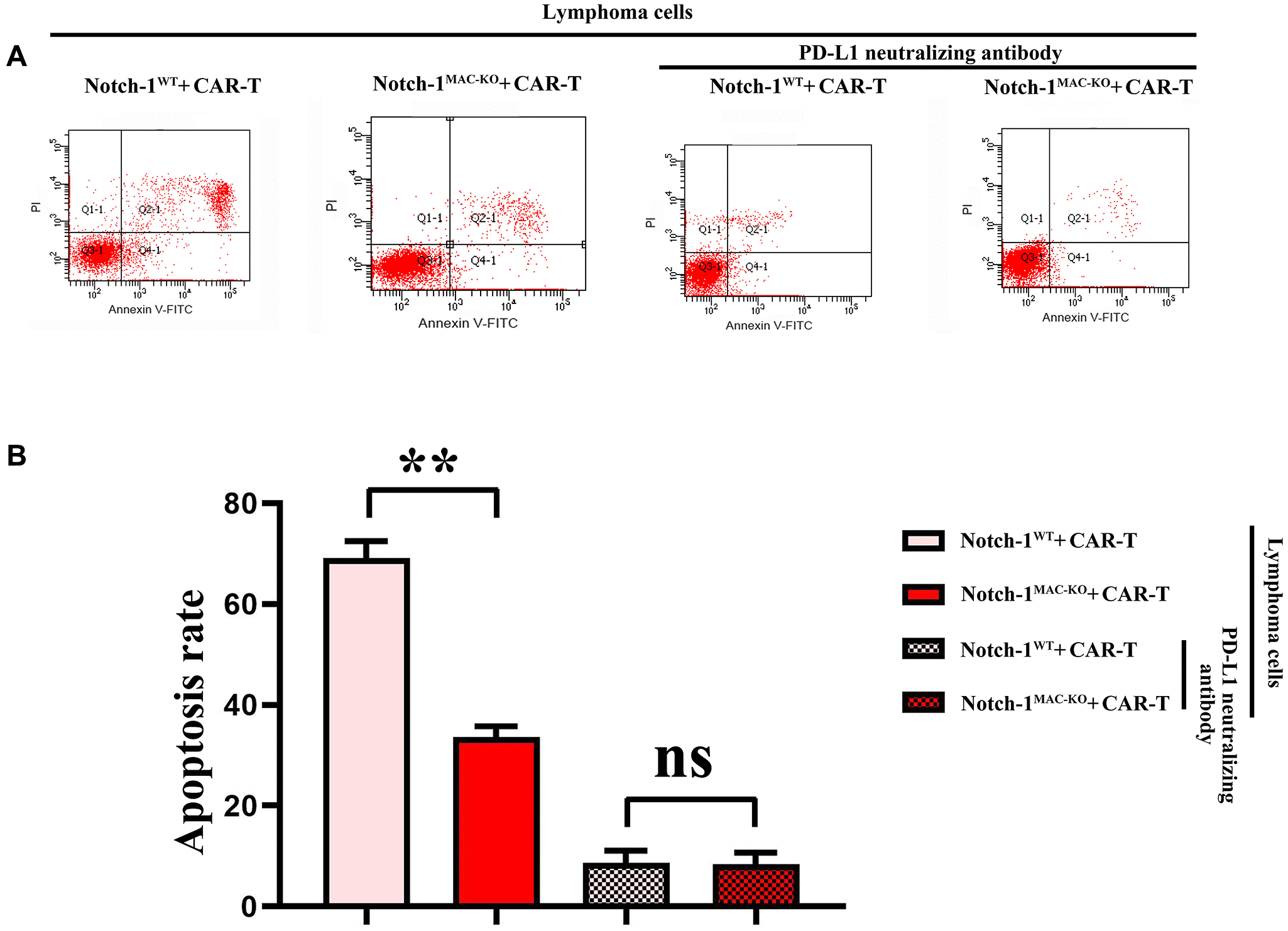 Figure 8. Flow cytometry of CAR-T cell apoptosis. (A) CAR-T cell apoptosis; (B) Data statistics of number of apoptotic CAR-T cells. (WT + lymphoma cell + CAR-T group vs. KO + lymphoma cell + CAR-T group; WT + lymphoma cell + CAR-T + PD-L1 neutralizing antibody group vs. KO + lymphoma cell + CAR-T + PD-L1 neutralizing antibody group; **P < 0.01, nsP > 0.05; N = 3).
