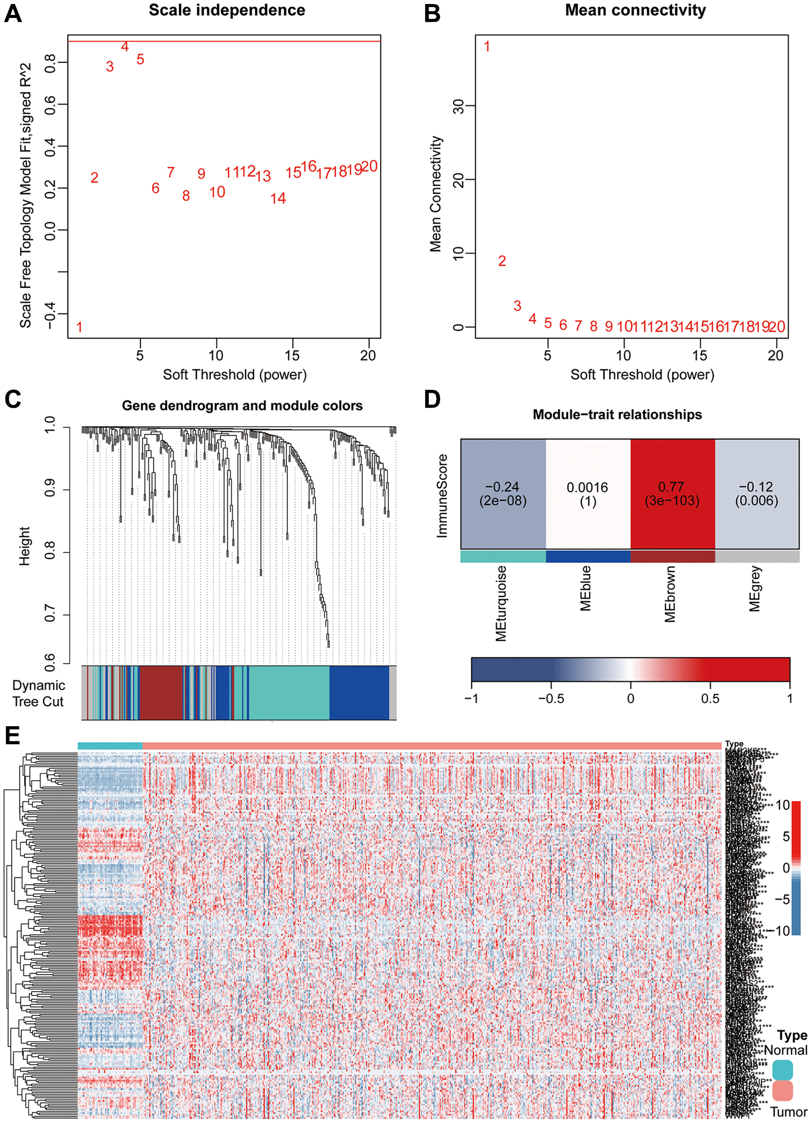 Figure 2. He combined application of WGCNA and differential analysis was used to screen key genes associated with aging. (A, B) The WGCNA algorithm demonstrated the optimal soft threshold. (C, D) The WGCNA algorithm identifies modules associated with immunity. (E) Heatmap showing differentially expressed aging-related genes.