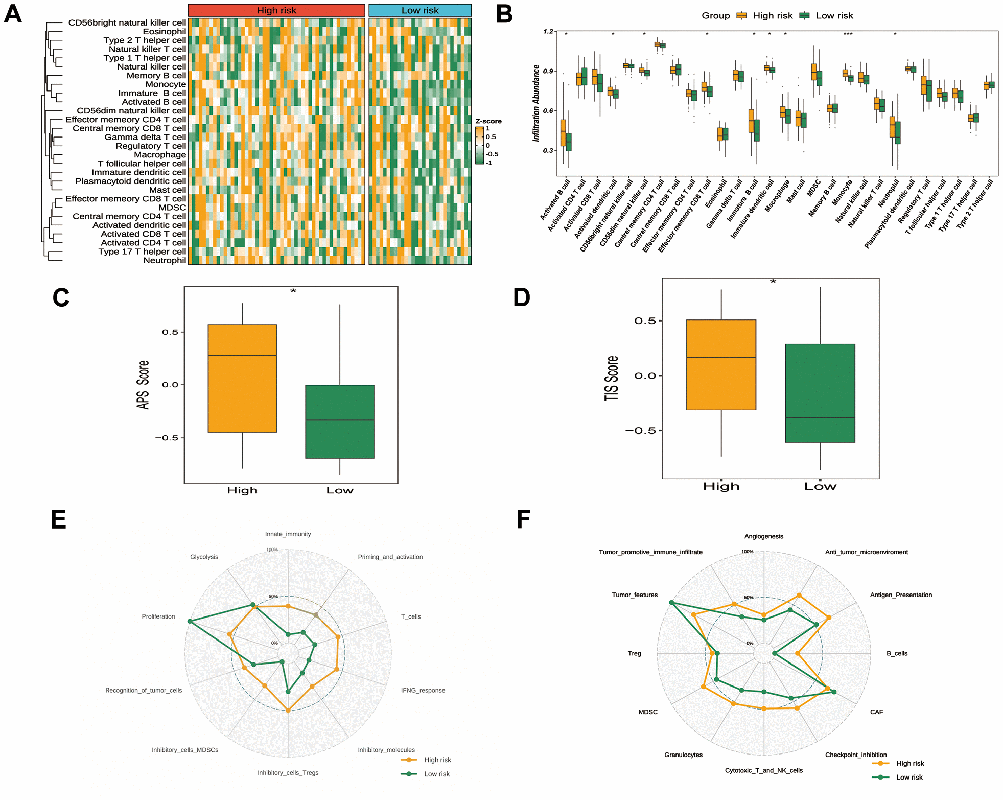Figure 6. Tumor immune microenvironment and status in different GRTTK groups. (A) A heatmap exhibiting ssGSEA enrichment scores for 28 immunogenic cell type markers, stratified by high- and low-risk groups as per the GRTTK prognostic model. (B) Relative abundance of infiltrating cell types differed across different risk groups based on GRTTKs. (C) Assessment and contrast of antigen presentation potential between high- and low-risk groups, stratified using the GRTTK prognostic signatures. (D) Contrast of TIS scores between high-risk and low-risk patient groups. (E, F) Radar chart depicting divergence in immune cycle gene set enrichment between risk groups based on the GRTTK model.