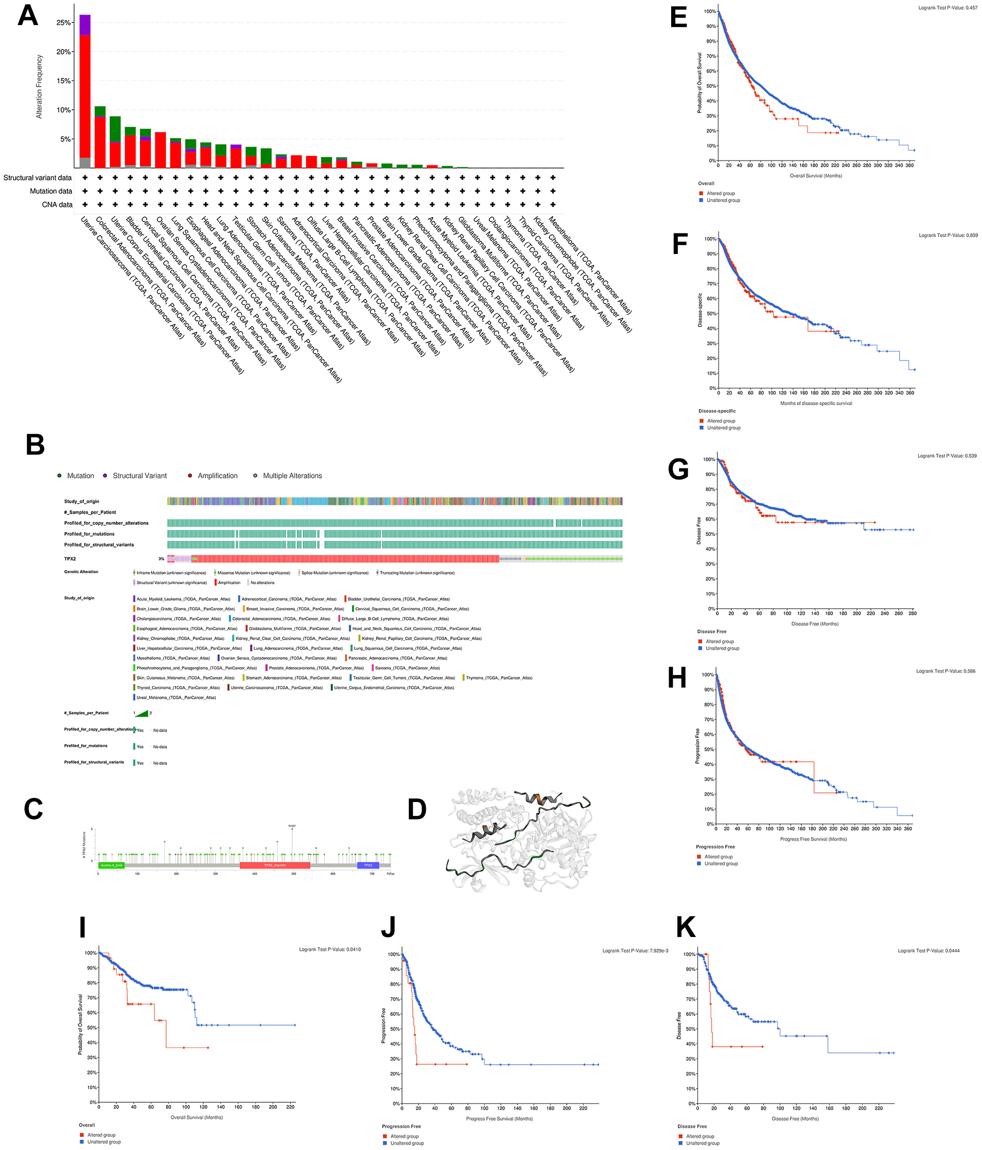Figure 5. Mutation characteristic of TPX2 in different cancer types. (A) The frequency of TPX2 mutations with mutation type across TCGA cancers by cBioPortal. Red represents amplicaion. Green represents mutation. Purple represents structural variant. Grey represents multiple alterations. (B) OncoPrint visual summary of alterations in a query of TPX2 by cBioPortal. (C) Mutation site of TPX2 displayed by cBioPortal. (D) Corresponding 3D structures of TPX2 displayed by cBioPortal. (E–H) The associations of pan-cancer TPX2 mutation status with OS, DSS, DFS and PFS by cBioPortal. (I–K) The associations of TPX2 mutation status with OS of UCEC patients (I) and survival of LUSC patients ((J) PFS; (K) DFS) by cBioPortal. p-value < 0.05 was considered statistically significant.