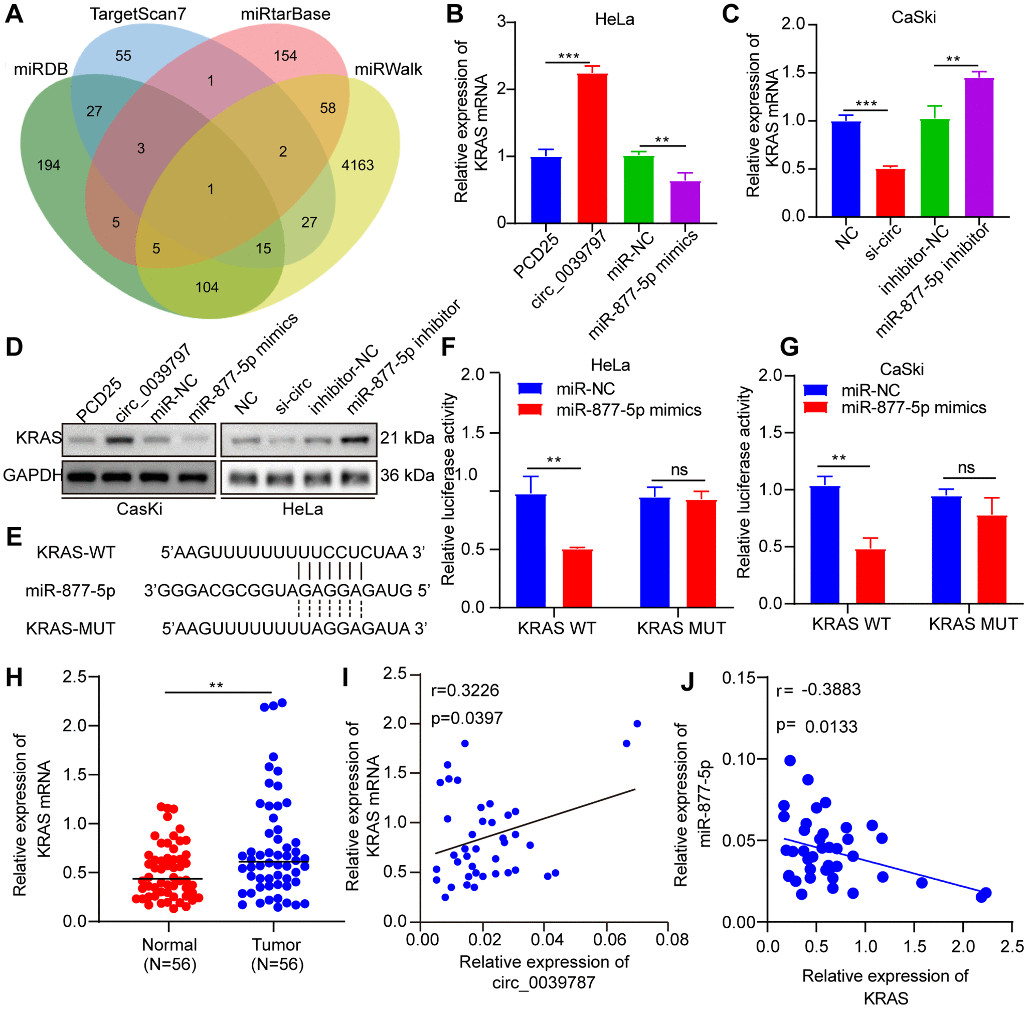 Figure 6. KRAS is a functional target of miR-877-5p. (A) Prediction of miR-877-5- target genes (B, C) KRAS mRNA levels. (D) KRAS protein levels. (E) Prediction of miR-877-5p and KRAS binding site. (F, G) Luciferase reporter assays of KRAS-WT and KRAS-MUT. (H) KRAS mRNA levels in CC and paracancerous tissues, N = 56. (I) Correlations between circ_0039787 and KRAS levels in CC tissues. (J) Correlations between KRAS and miR-877-5p levels in CC tissues. **P < 0.01, ***P < 0.001.