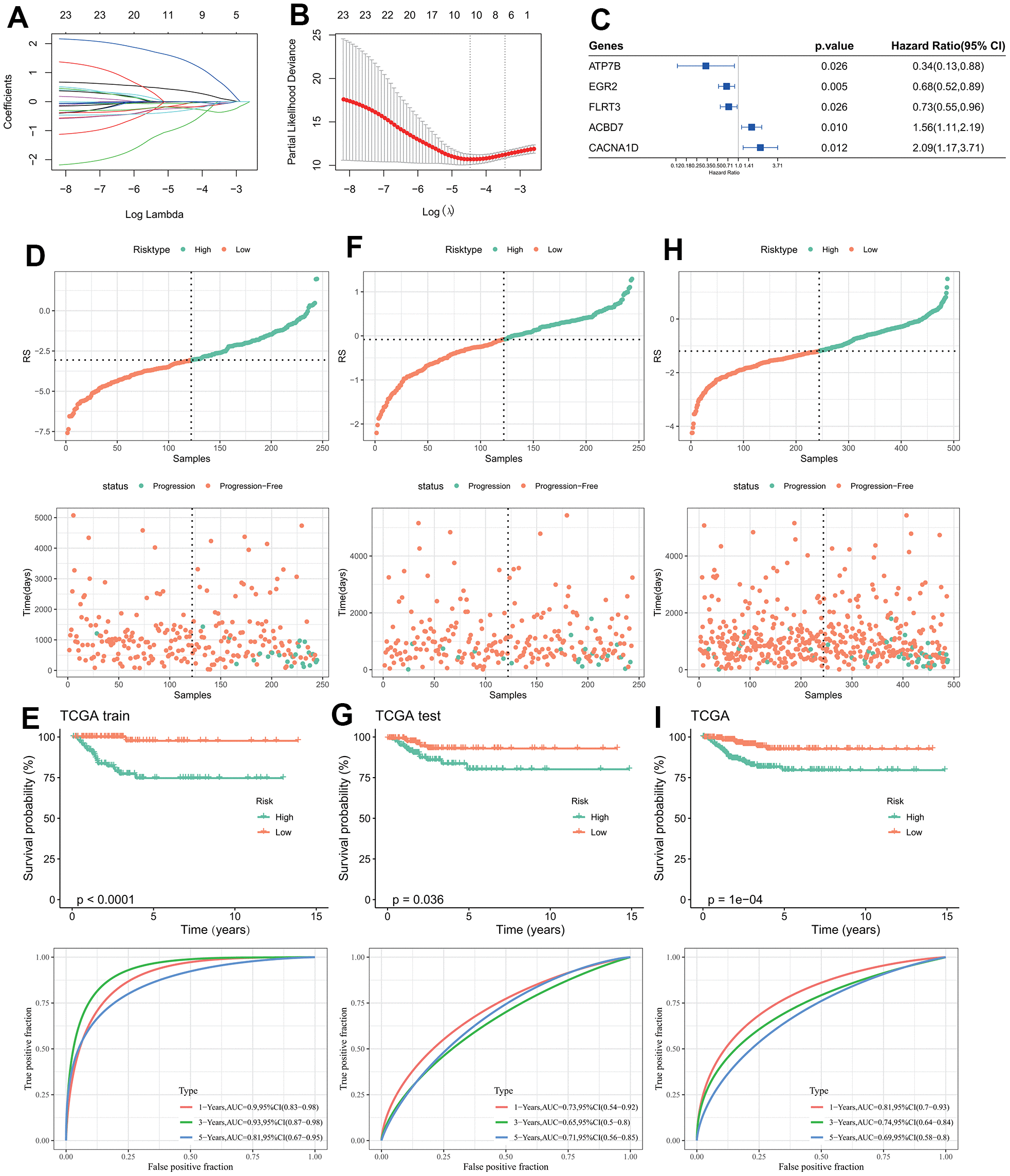 Figure 2. Design and validation of RiskScore model. (A) The trajectory of each independent variable changing with lambda; (B) Confidence interval under lambda; (C) Forest map of characteristic gene prognosis; (D, E) RiskScore of TCGA training set, ROC curve and KM curve of RiskScore model; (F, G) RiskScore of TCGA test set, ROC curve and KM curve of RiskScore model; (H, I) RiskScore of TCGA data set, ROC curve and KM curve of RiskScore of model.