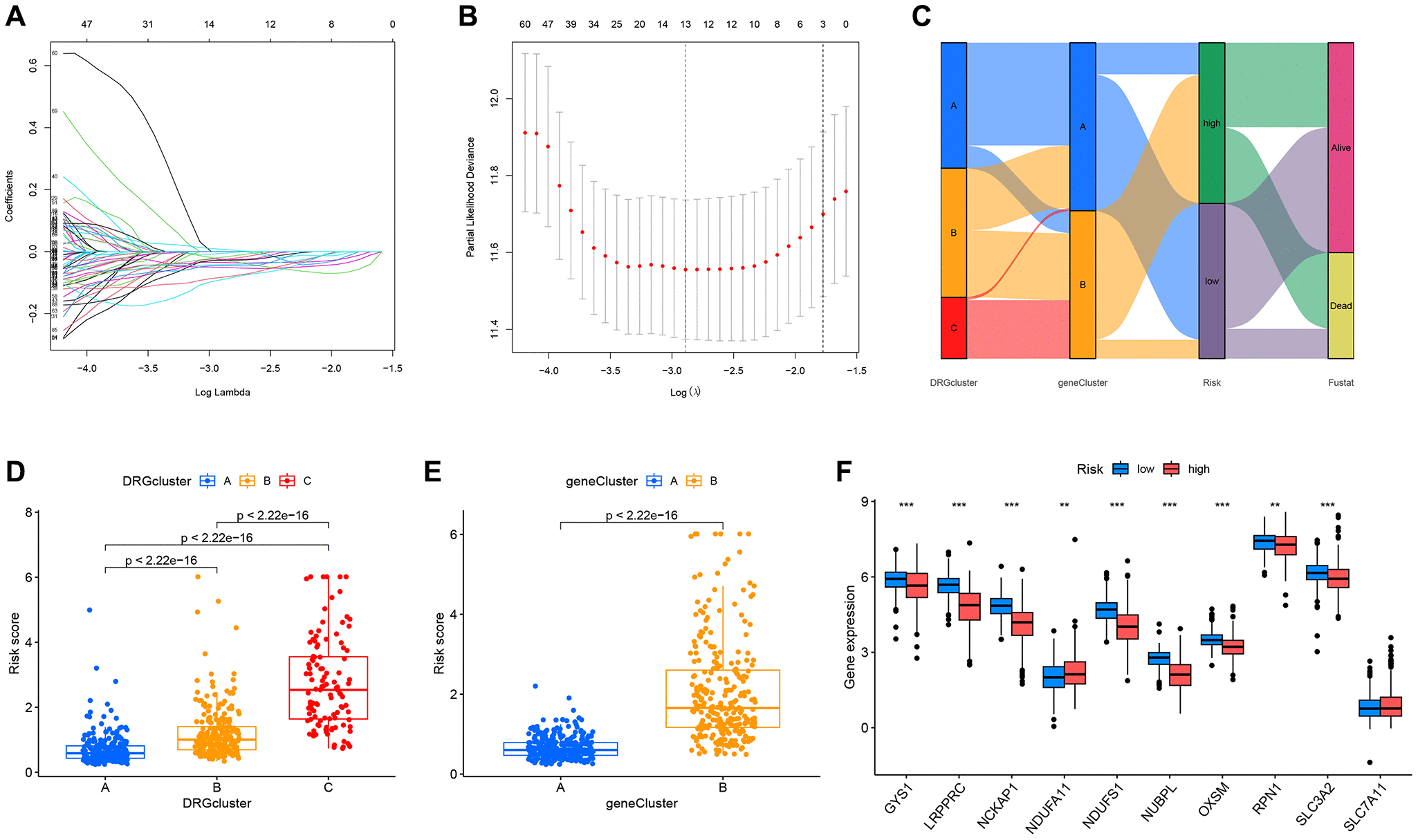 Figure 6. Construction of the prognostic DRG risk scoring model. (A, B) LASSO regression analysis. (C) Sankey diagram showing the relationship between different molecular subtypes, genetic subtypes, risk scores, and survival outcomes. (D, E) Respective risk scores of different molecular subtypes and genetic subtypes. (F) Box plot displaying the analysis of differences in DRGs expression between the high and low-risk groups.