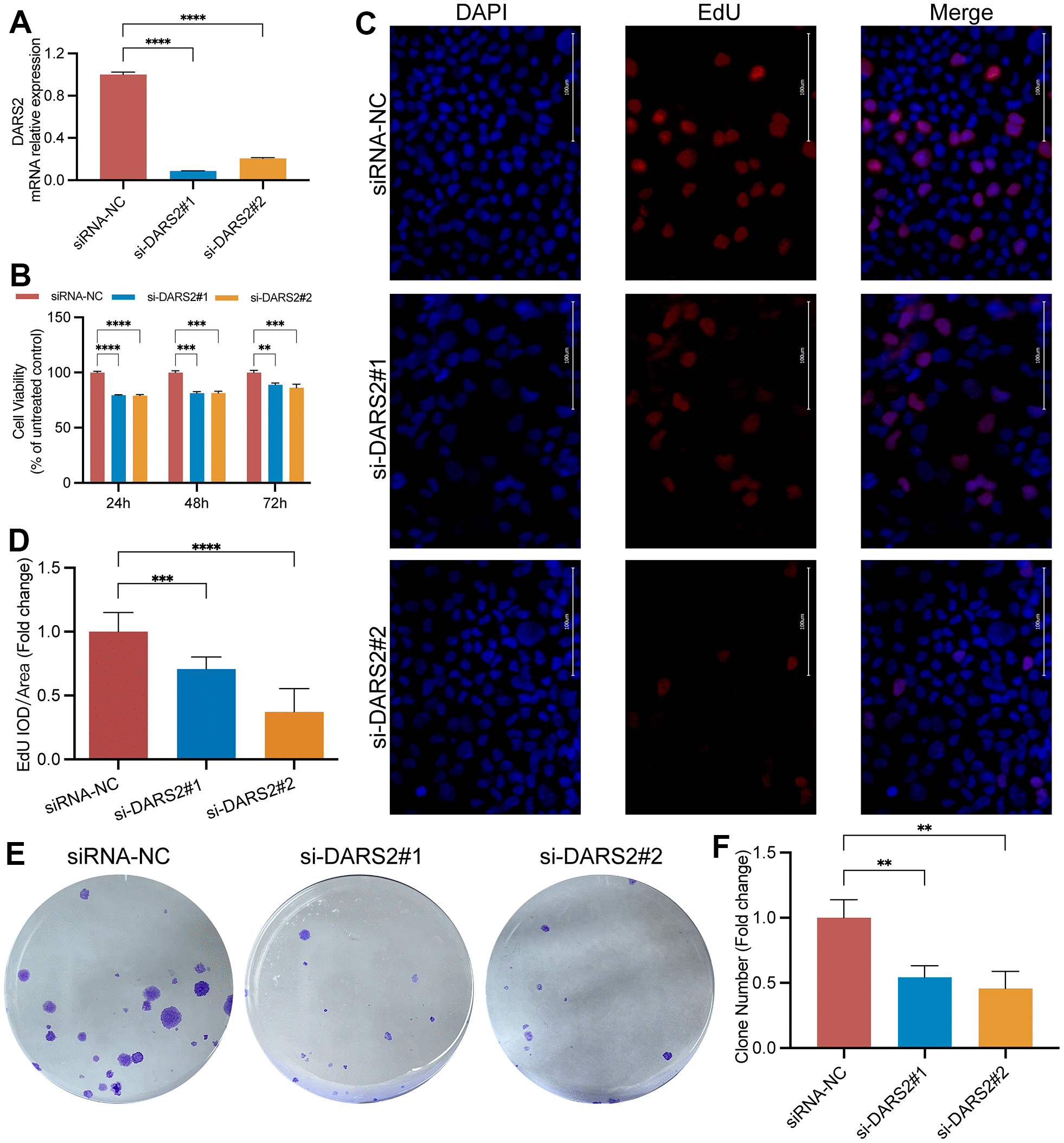 Figure 4. DARS2 knockdown inhibits ESCA cell proliferation. (A) The interference efficiency of two siRNAs was confirmed by qRT-PCR experiments. The results of CCK-8 assay (B), EdU proliferation experiments (C, D), and colony formation assay (E, F) demonstrated a significant decrease in cell proliferation activity in the experimental group compared to the control group. *p < 0.05; **p < 0.01; ***p < 0.001; ns, no significance.