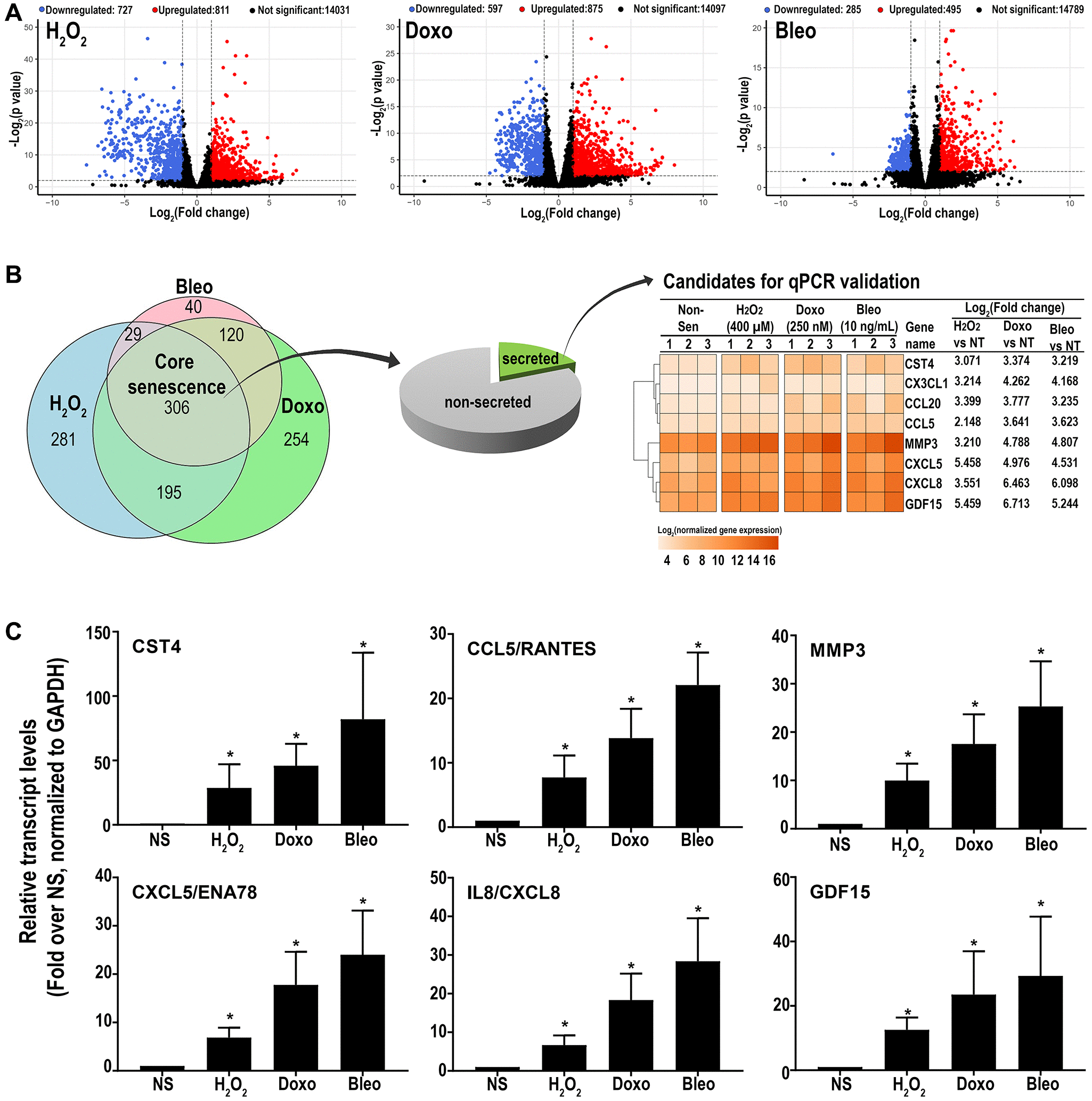 Figure 2. (A) Volcano plots of differentially expressed transcripts versus non-senescent proliferating (NS) cells (B) A Venn diagram showing a ‘core senescent profile’ of transcripts upregulated by all senescence inducers and heatmap of the eight candidates selected for validation at the transcriptomic level by qPCR (C). Data are Mean ± SEM (*p < 0.04 versus NS) senescent or non-senescent fibroblast lines from 7 subjects. (C) Quantitative RT-PCR assay results of 6 genes in the core senescence SASP demonstrates increased expression of all of the genes by any of the senescence inducing agents.
