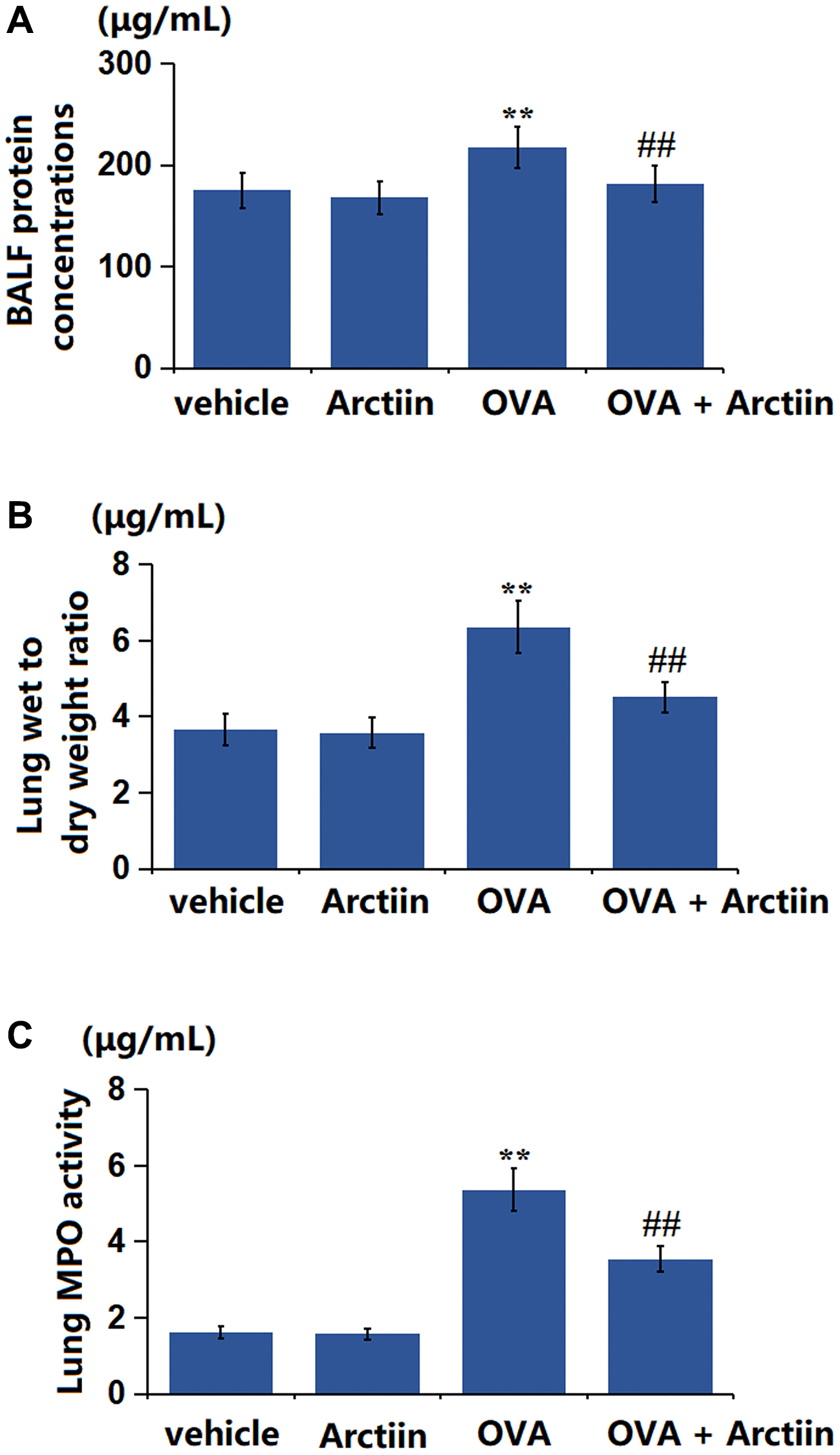 Figure 4. Arctiin ameliorated OVA-induced lung tissue impairment. C57BL/6 mice were divided into four groups: vehicle, Arctiin, OVA, and OVA+ Arctiin. (A) BALF protein concentrations; (B) Lung wet to dry weight ratio; (C) Lung MPO activity (n = 12, **P < 0.01 vs. vehicle group; ##P < 0.01 vs. OVA group).