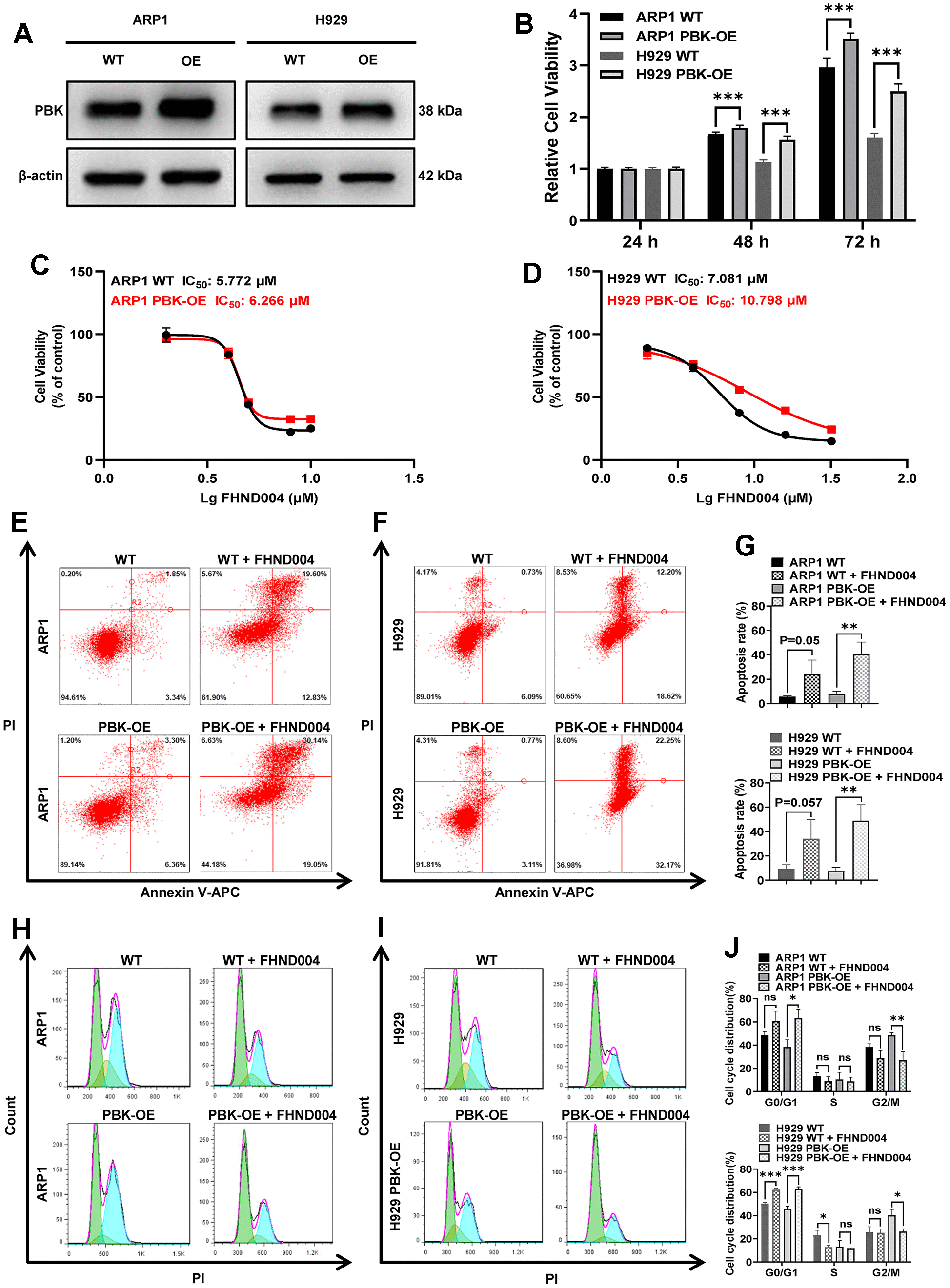 Figure 6. FHND004 targets PBK to inhibit MM cell proliferation. (A) WB analysis confirmed that PBK-OE MM cells were constructed successfully verified. (B) The proliferation of PBK-OE and PBK-WT cells was detected by CCK-8. (C, D) Effects of 48 h treatment with FHND004 on the viability of ARP1 (C) and H929 (D) WT and PBK-OE cells. (E–G) Effects of 24 h treatment with FHND004 (4 μM) on the apoptosis of ARP1 (E) and H929 (F) WT and PBK-OE cells. (H–J) Effects of 48 h treatment with FHND004 (4 μM) on the cell cycle phases of ARP1 (H) and H929 (I) WT and PBK-OE cells. The data were expressed as the mean ± SD, n = 3; p < 0.05 (*), p < 0.01 (* *) and p < 0.001 (* * *).