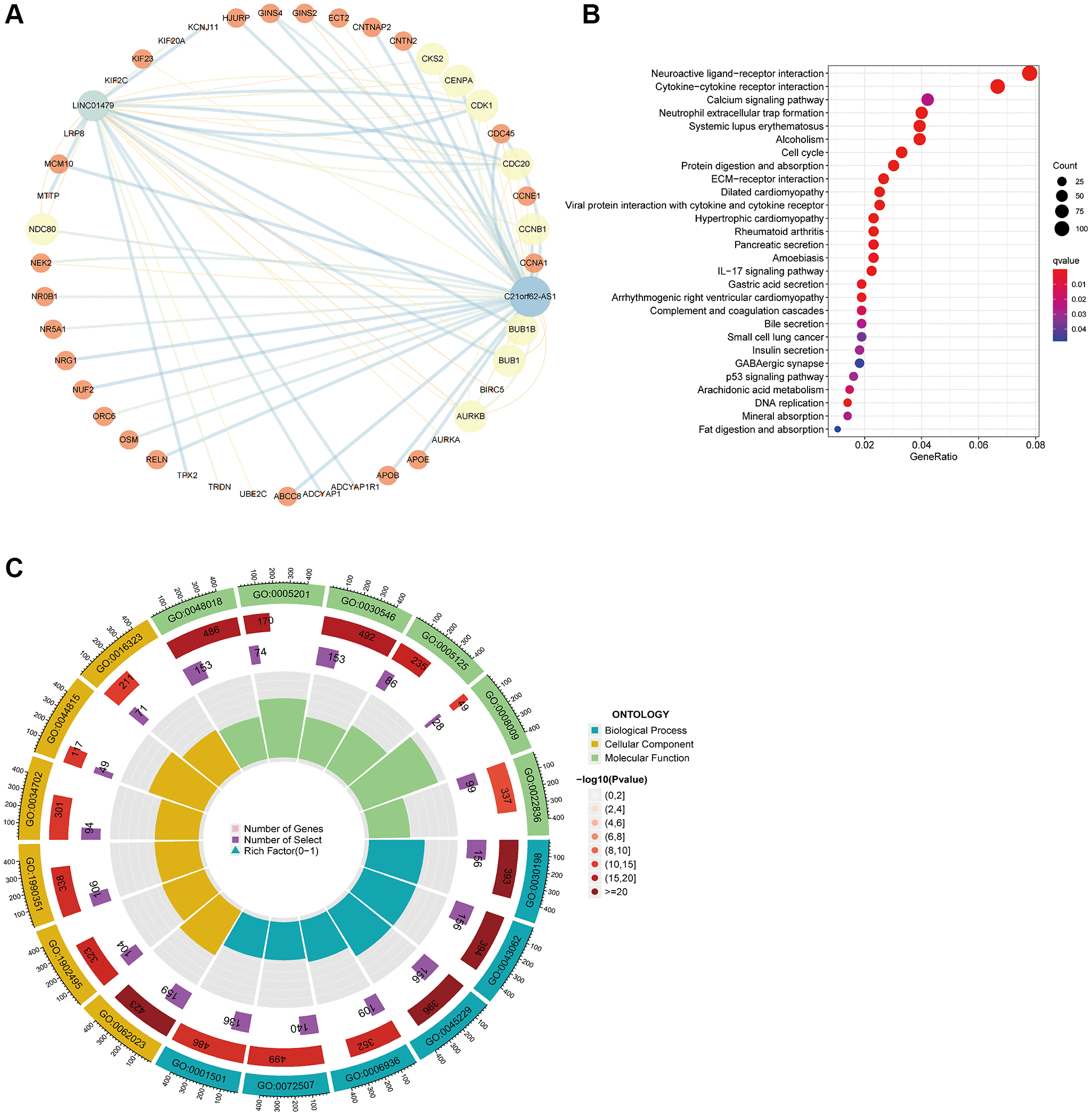 Figure 7. Functional enrichment analysis of lncRNA target genes. (A) Regulatory network of two lncRNA and core target genes. (B) KEGG enrichment analysis of core target genes. (C) GO enrichment analysis results of 74 core target genes.