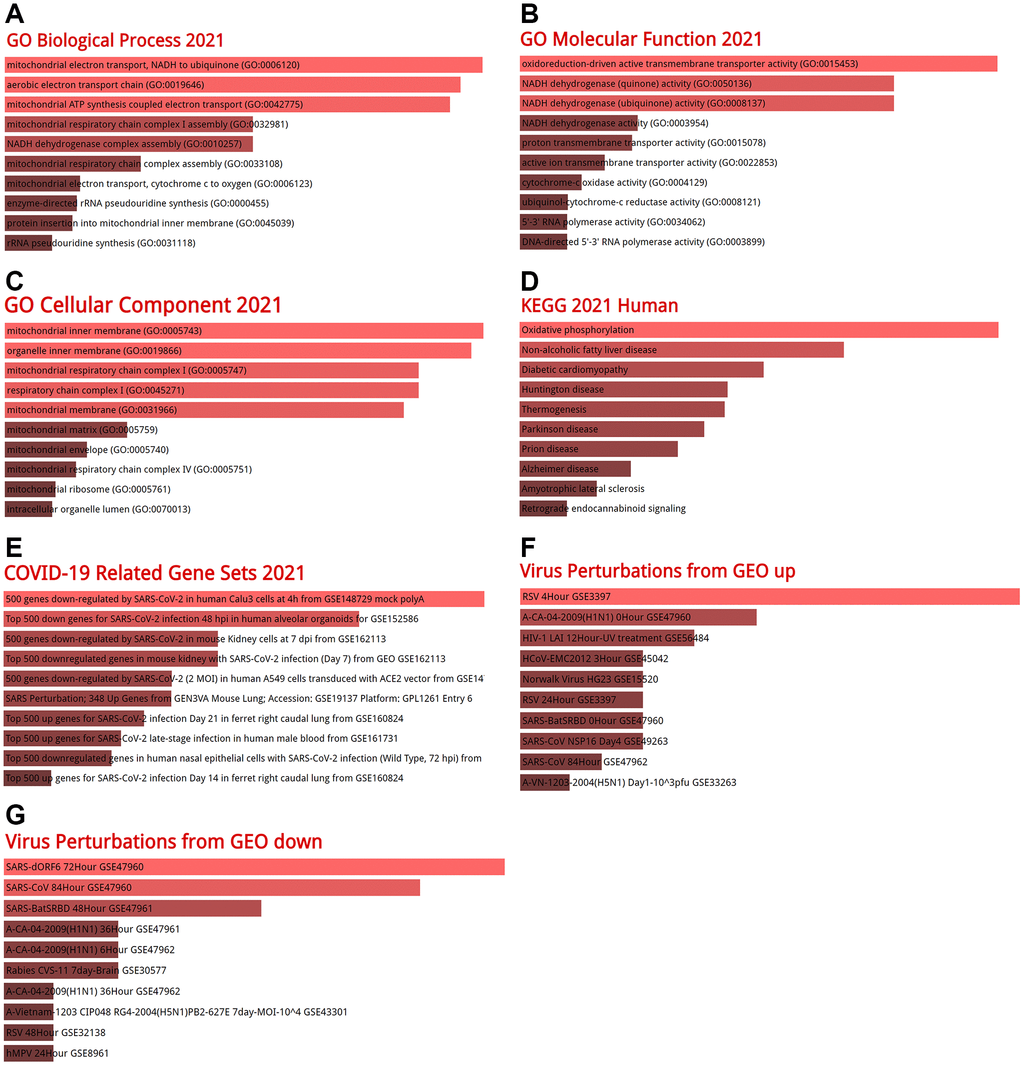 Figure 10. GO enrichment analysis and KEGG signaling pathway analysis. (A) Biological processes, (B) molecular functions, (C) cellular components, (D) KEGG analysis, (E) COVID-19 related gene sets 2021, (F) virus perturbations from GEO up, (G) virus perturbations from GEO down. Abbreviations: GO: gene ontology; KEGG: Kyoto encyclopedia of genes and genomes.