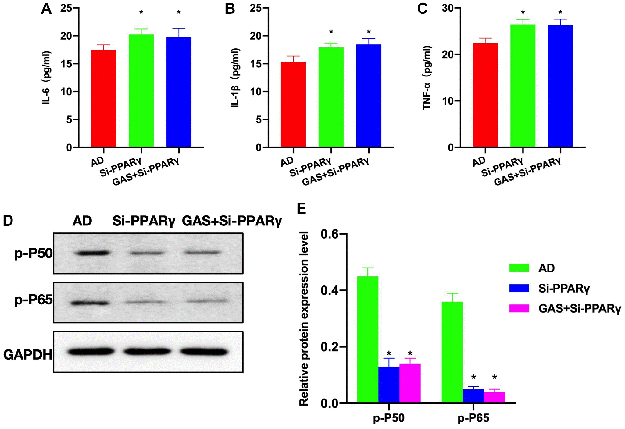 Figure 6. Effects of PPARγ silencing on the AD mice pathology. (A–C) ELISA (n = 10), Si-PAPRγ and GAS+Si-PPARγ groups exhibited higher levels of inflammatory cytokines compared to the AD group. (D, E) Relative protein expressions (n = 5), p-P50 and p-P65 expressions differed insignificantly between the Si-PAPRγ and GAS+Si-PPARγ groups. *P < 0.05 vs. AD.