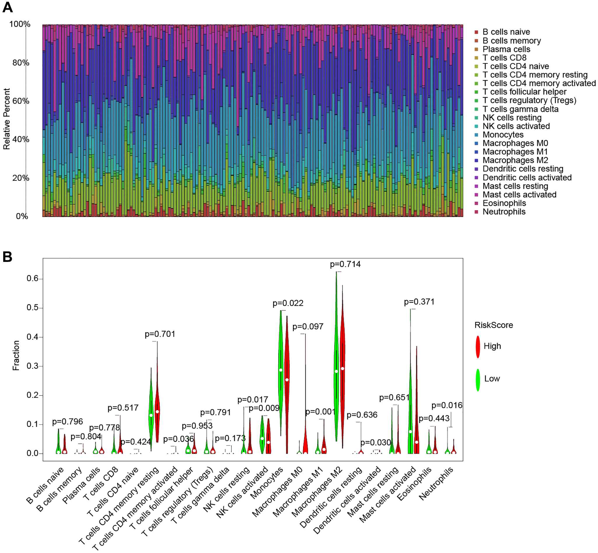 Figure 9.The CIBERSORT method for immune cell and risk model analysis. (A) A histogram of the percentage of 22 immune cell species in TCGA samples. (B) Violin plot of the percentage of immune cells in the sample.