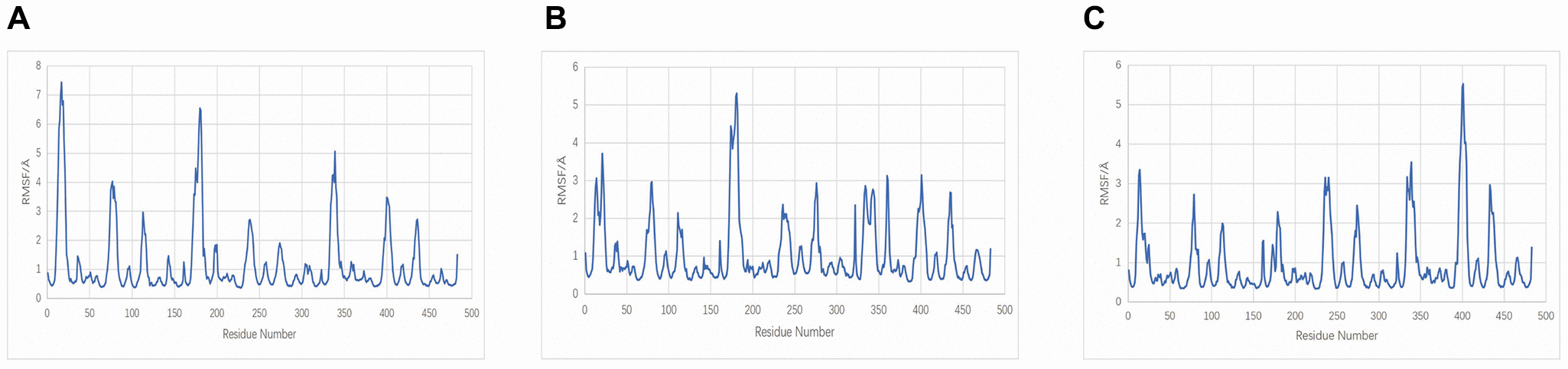 Figure 9. RMSD plot during molecular dynamics simulations. (A) TNF-Neocryptotanshinone II; (B) TNF-Patchoulenone; (C) TNF-Tanshinone IIA.