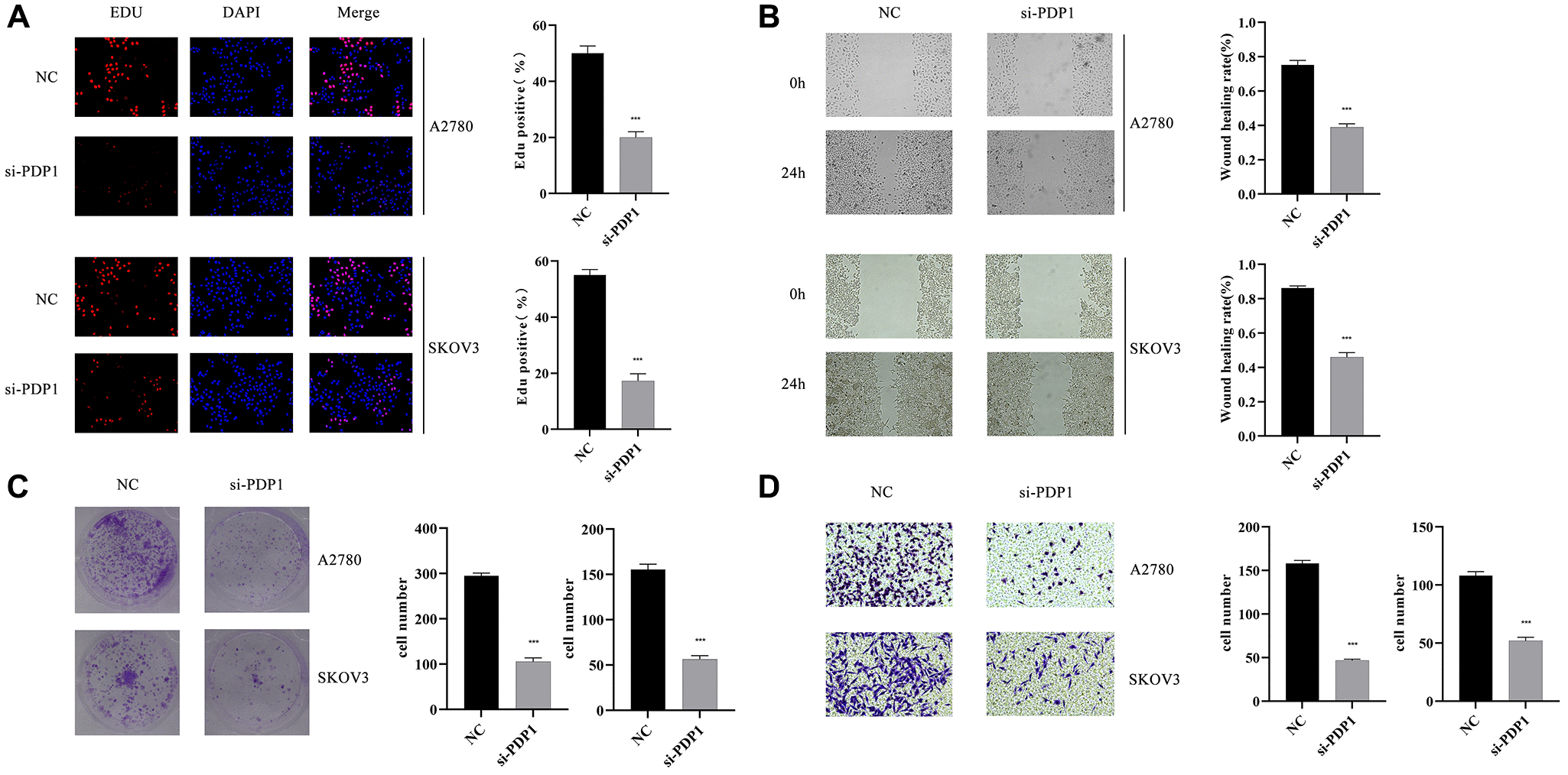 Figure 11. The impact of PDP1 knockdown on proliferation, invasion, and migration was investigated in two cell lines, SKOV3 and A2780. (A) EdU assay revealed a reduced number of proliferating cells in the si-PDP1 group compared to controls. (B) Wound-Healing assay demonstrated a decreased migration ability of cells in the si-PDP1 group. (C) Colony formation assay showed a reduced number of cell colonies formed in the si-PDP1 group. (D) Transwell assay indicated a decreased invasion ability of cells in the si-PDP1 group.