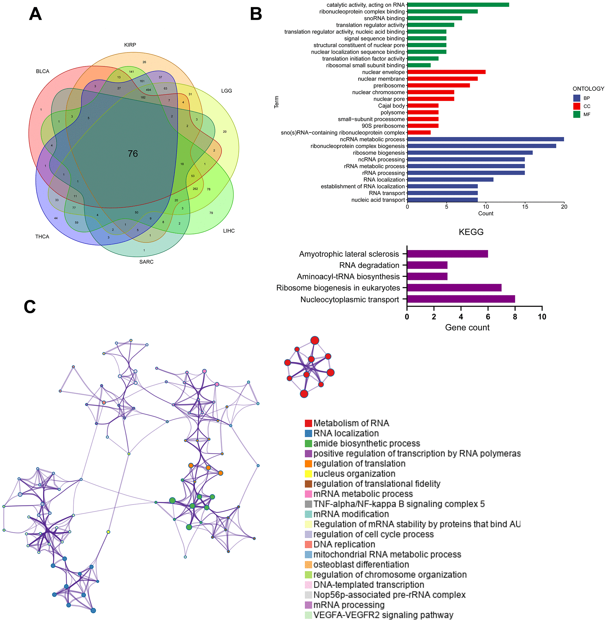 Figure 7. Analysis of PUS7-related regulatory pathways. (A) The intersecting genes which significantly correlated with DEGs were obtained using Spearman’s correlation analysis (p < 0.05, Cor > 0.4). (B) GO (top) and KEGG (bottom) analysis for the PUS7-related regulatory genes. (C) PUS7-related regulatory genes were mainly enriched in the mitotic cell cycle and DNA metabolic processes. The interactive network was constructed using the Meta scape online platform.