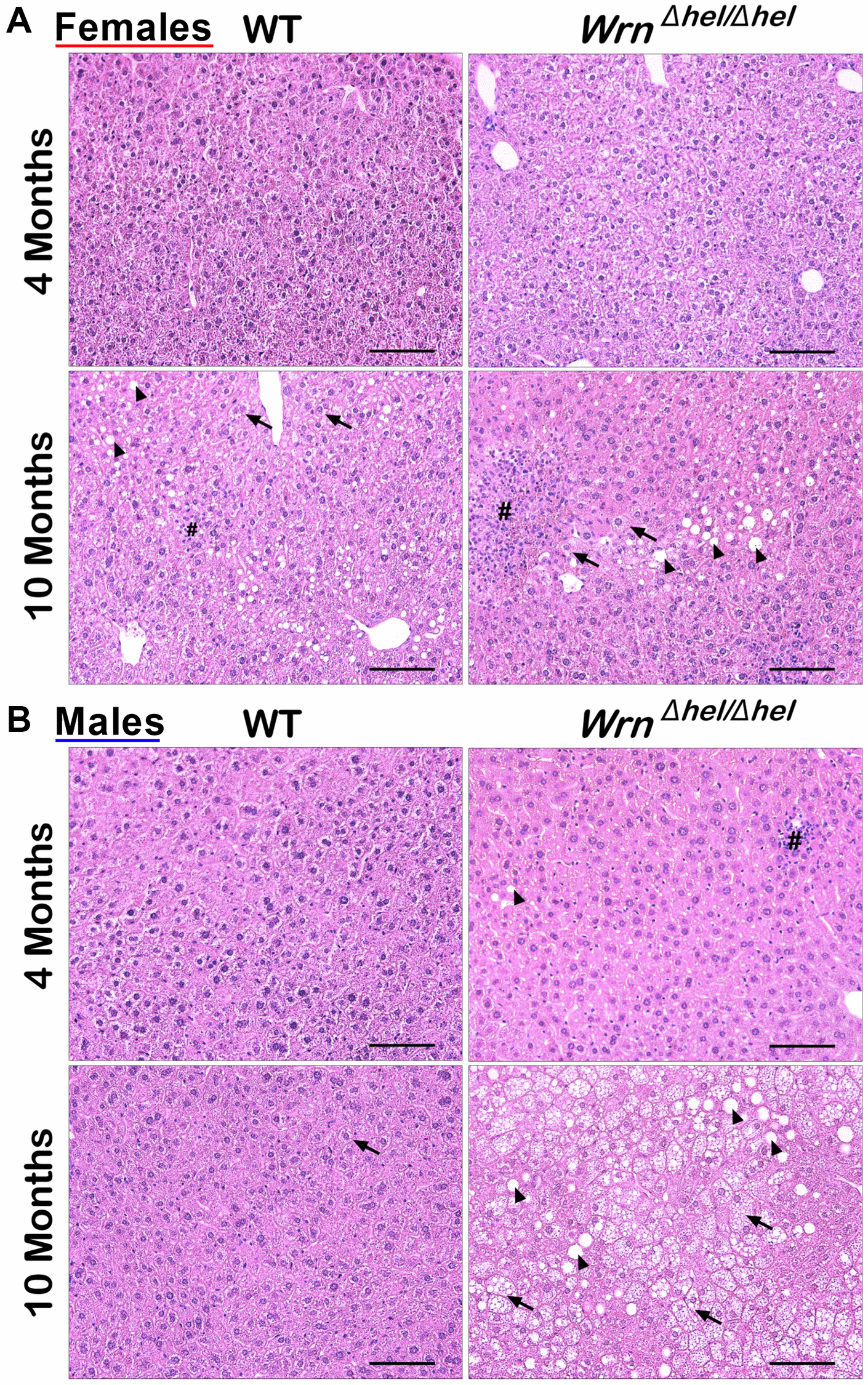 Figure 2. Representative histology of the liver in wild type and WrnΔhel/Δhel mice at four and ten months of age. (A) Representative histological sections from females. (B) Representative histological sections from males. All photomicrographs: hematoxylin and eosin; magnification 200X. Scale bars on the images represent 100 μm. # = inflammatory cell aggregation; arrowheads = macrovesicles; arrows = cytoplasmic microvesicles.