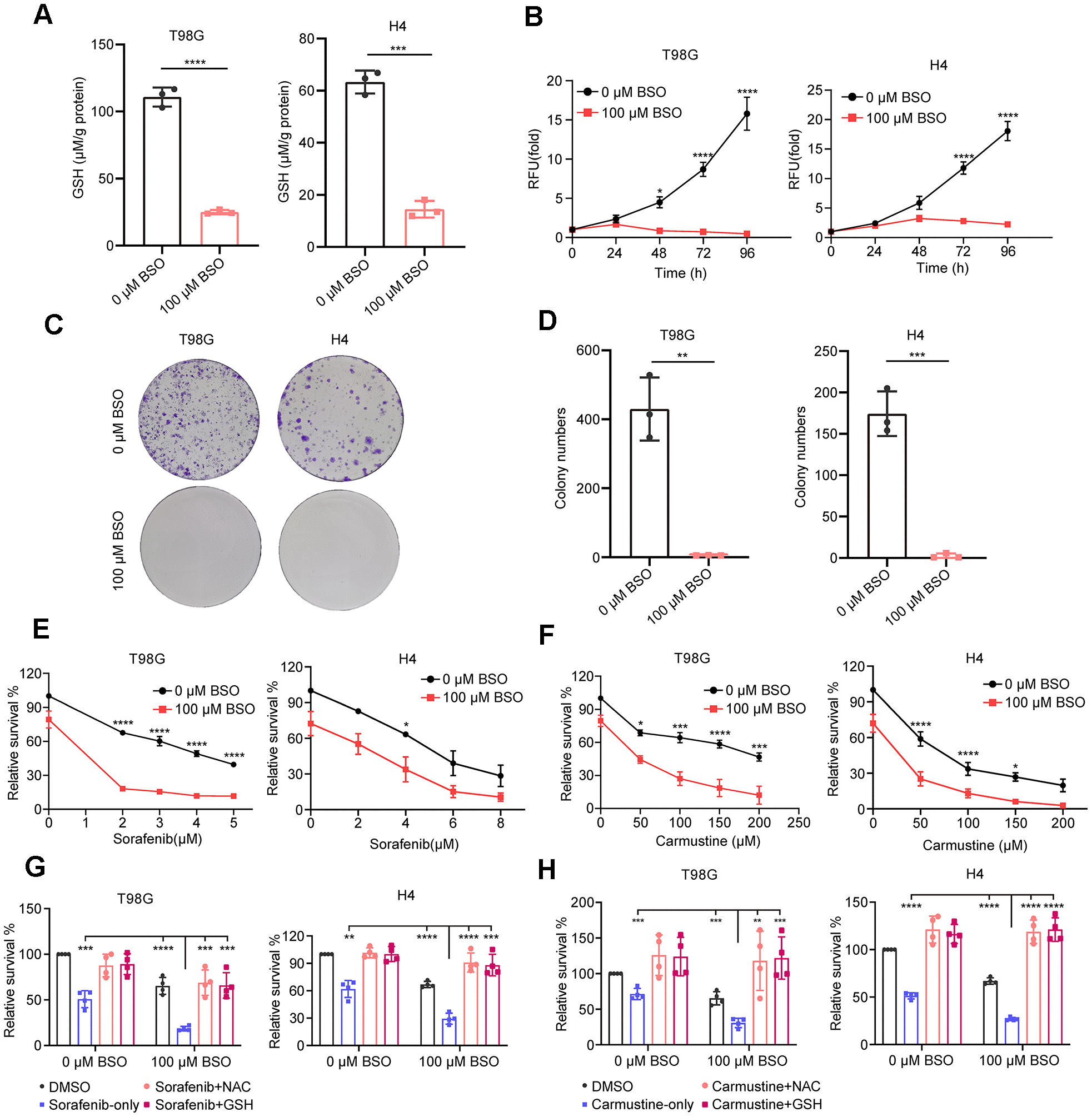 Figure 7. Effect of decreased GSH levels on glioma cell proliferation and drug resistance. (A) Measurement of glutathione content in T98G and H4 cell lines following preincubation with 100 μM L-buthionine-S,R-sulfoximine (BSO) for 24 h. (B) Effect of BSO treatment on the proliferation of T98G and H4 cell lines. (C) Colony formation results in response to BSO treatment. (D) Histograms showing the number of colonies under different experimental conditions. (E, F) Measurement of cell viability in T98G and H4 cells treated with varying concentrations of sorafenib or carmustine, either in combination with PBS or BSO (100 μM), for 24 h. (G, H) Cell viability assessment in T98G and H4 cells treated with BSO (100 μM) and sorafenib (4 μM) or carmustine (100 μM for T98G, 50 μM for H4), along with NAC (5 mM) or GSH (5 mM), for 24 hours. All data points are presented as mean ± SD from three or four independent experiments.