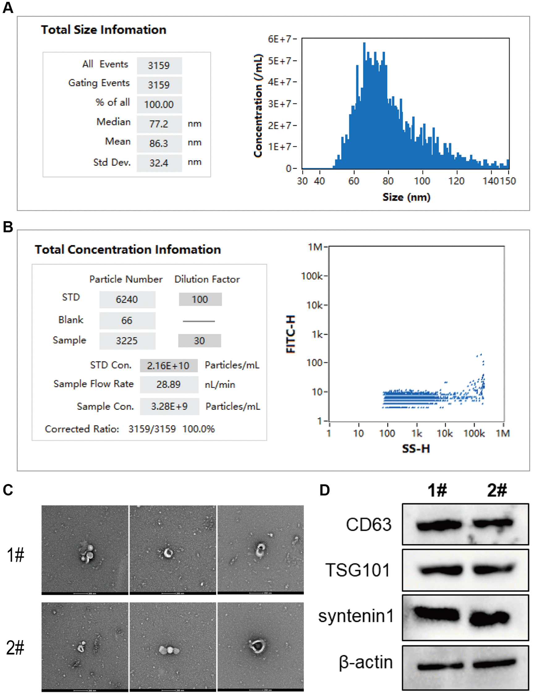 Figure 2. Extraction and identification of exosomes from rabbit serum for biological activity. (A) The analysis of exosome particle size using nanoscale flow cytometry; (B) The analysis of exosome concentration. (C, D) Transmission electron microscopy images of exosomes in serum samples from rabbit models with femoral fractures, where C shows the exosome suspension at dilutions of 10, 30, and 50-fold from left to right, and D illustrates the protein expression of CD63, TSG101, and syntenin1 in exosomes from the serum of rabbit models with femoral fractures.