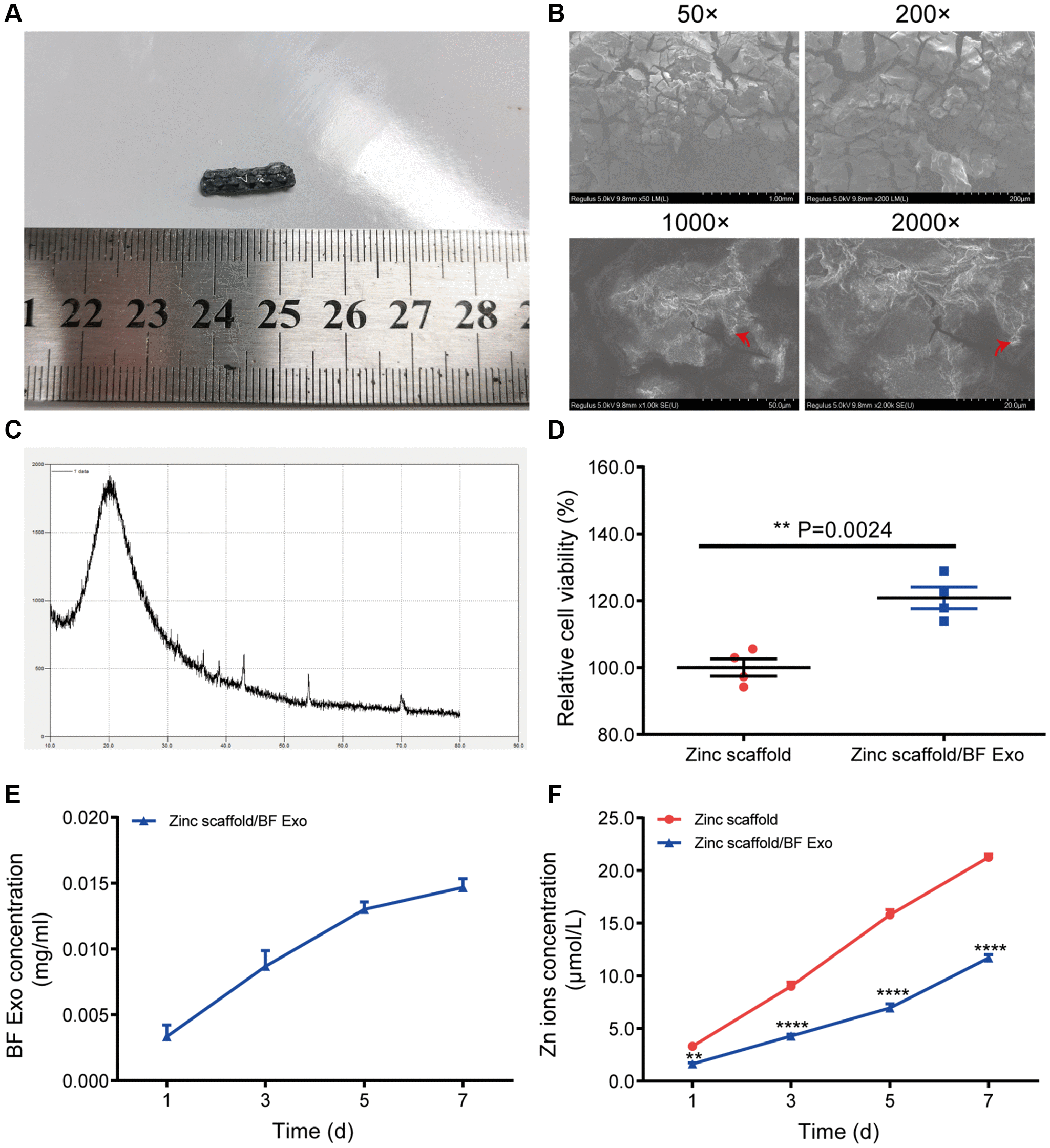 Figure 3. Preparation of zinc scaffold/BF Exo composite implant. (A) Solid images of degradable zinc stent/BF Exo composite implant; (B) Electron microscopy images of degradable zinc stent/BF Exo composite implant at 50, 200, 1000, and 2000 times magnification, with red arrows indicating small amounts of exosomes encapsulated in the gel; (C) X-ray diffraction patterns of degradable zinc stent/BF Exo composite implant; (D) CCK-8 experiment results after co-culturing BMSCs cells with degradable zinc stent/BF Exo composite implant for 3 days; (E) In vitro release results of exosomes from zinc stent/BF Exo composite implants after incubation for 1, 3, 5, and 7 days; (F) In vitro release results of zinc ions after incubating two types of stents for 1, 3, 5, and 7 days (**P < 0.01, ****P < 0.0001 vs. Zinc scaffold, n = 3).