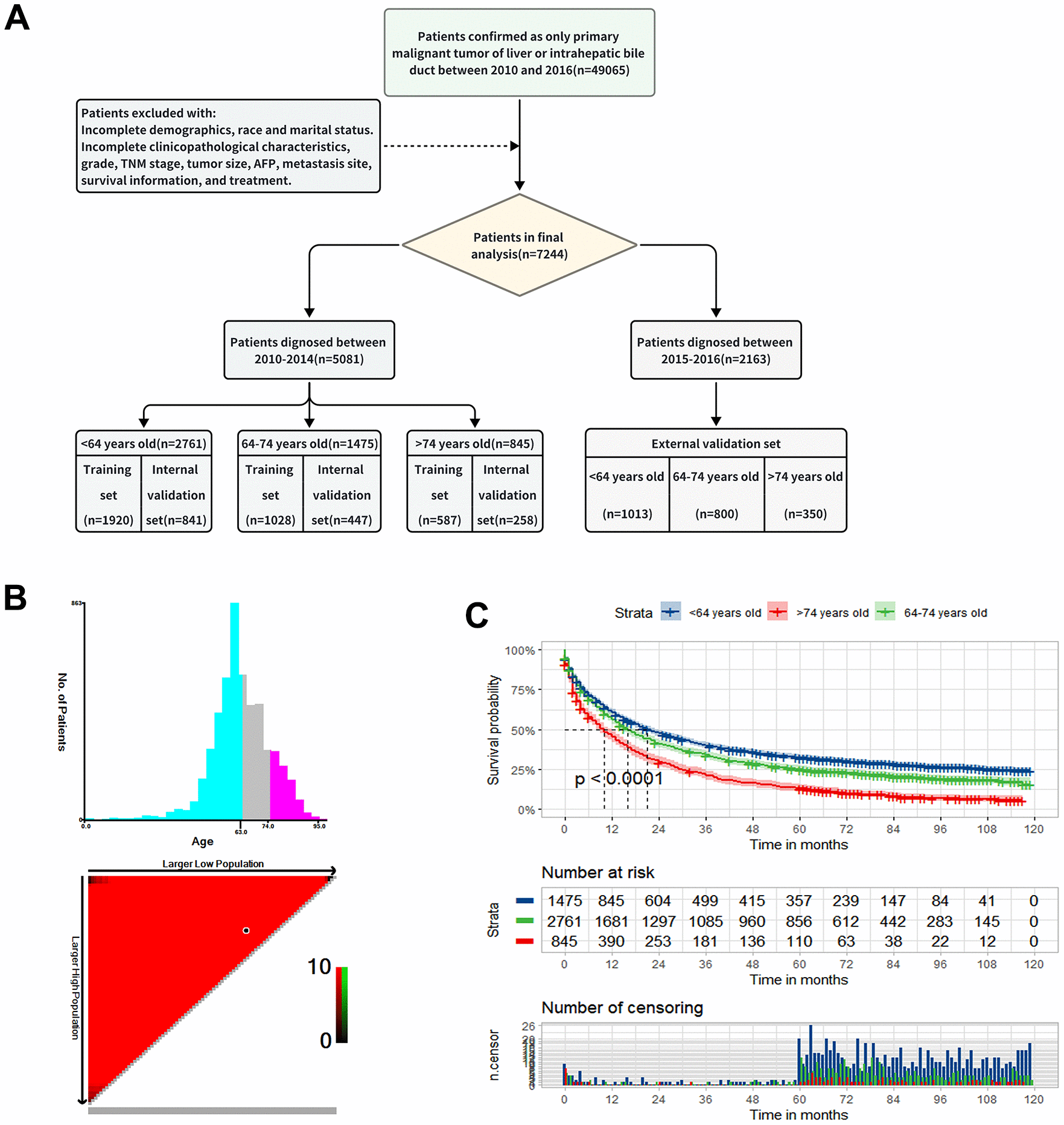Figure 1. Study design and patient selection. (A) The study flow diagram. (B) The optimal age cut-off point for overall survival (OS) defined with X-tile software. (C) The Kaplan-Meier curve for overall survival among the low, middle and old age groups.