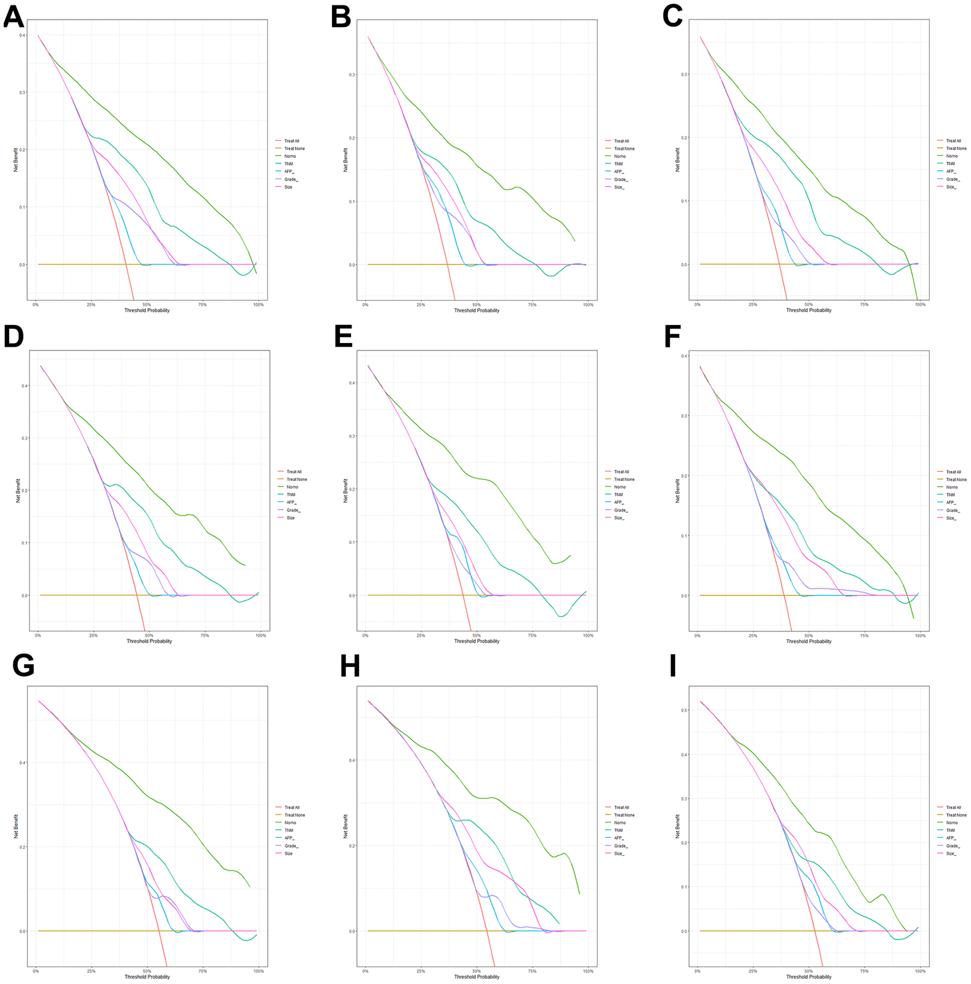 Figure 6. Comparison of clinical utility between our model and existing predicting factors. The decision curve analysis (DCA) curves for the prediction of OS based on nomogram, TNM stage, AFP, grade and Tumor size in the training, internal and external validation set of low-age group (A–C), middle-age group (D–F) and old-age group (G–I).