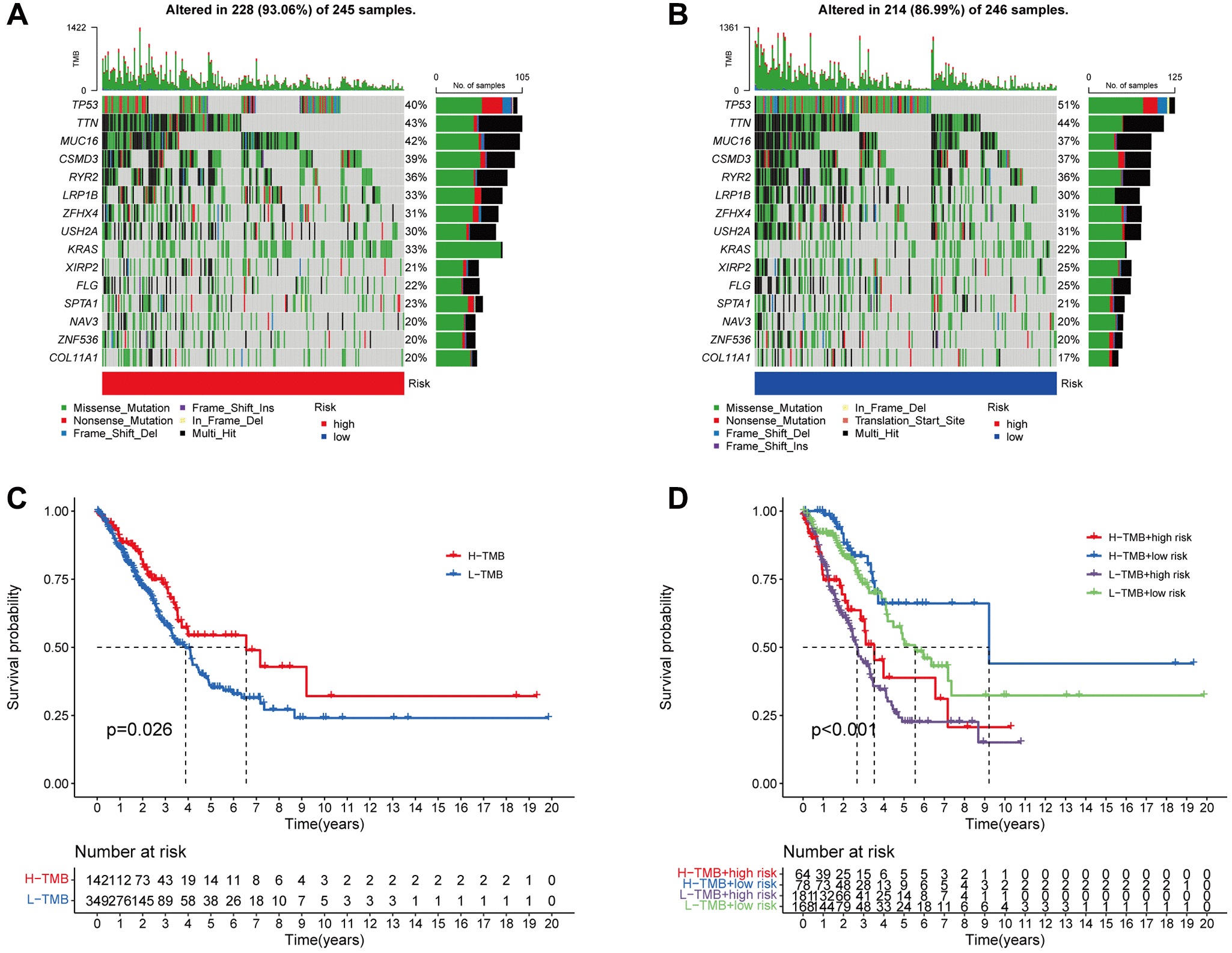 Figure 9. The association between the signature and the TMB. The 15 genes that are mutated most frequently in high-risk (245) and low-risk (246), LUAD patients, are displayed in the waterfall plot (A, B). Survival curves (C) and (D) illustrate the survival probabilities in groups with high and low TMB risks, and a combined TMB-risk survival curve, respectively.