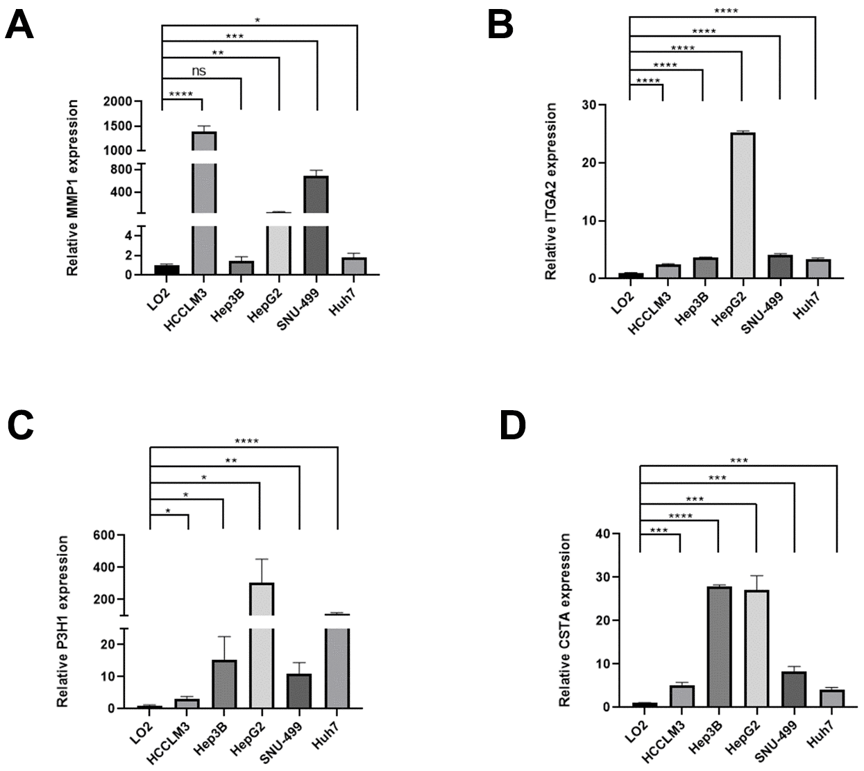 Figure 10.The expression differences of normal liver and HCC cell lines. The expression differences of MMP1 (A), ITGA2 (B), P3H1 (C), and CTSA (D) in normal liver and HCC cell lines.