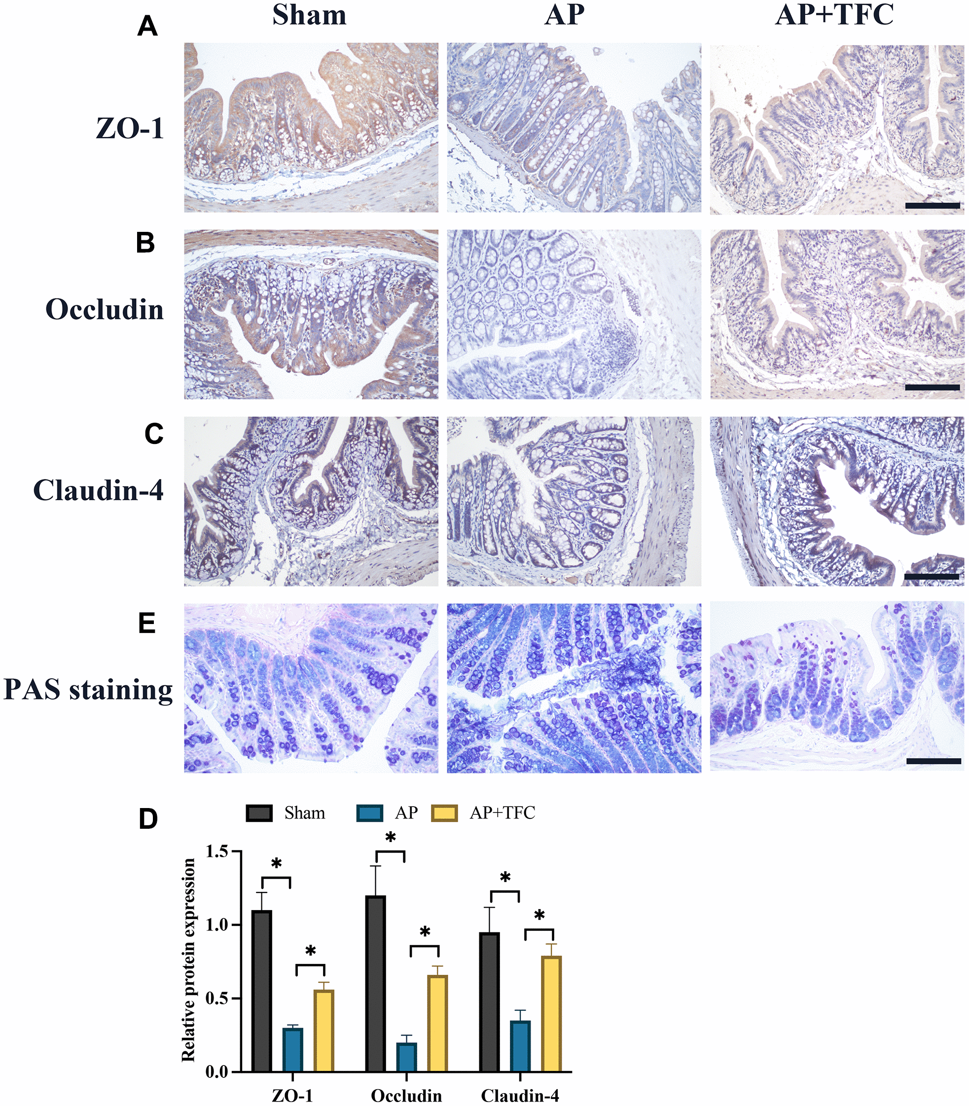 Figure 3. The dysfunction of colonic barrier induced by AP was suppressed by TFC. (A–D) The expression intensity of ZO-1, Occludin, Claudin-4, were measured with IHC staining (Magnification 200X); (E) PAS staining method was performed to detect intestinal mucus in tissues. * indicates p<0.05. Scale: 200 μm.