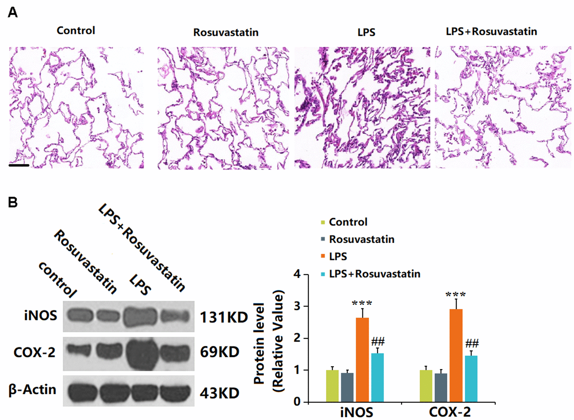 Figure 4. Rosuvastatin reduced lung inflammation in LPS-treated mice. (A) Lung tissues from each treated group were fixed, sectioned, and stained with hematoxylin and eosin (H and E staining); Scale bar, 500 μm; (B) The expression of iNOS and COX-2 proteins in lung tissues was detected using Western blotting (n=8, ***, P<0.005 vs. control; ##, P<0.01 vs. LPS group).