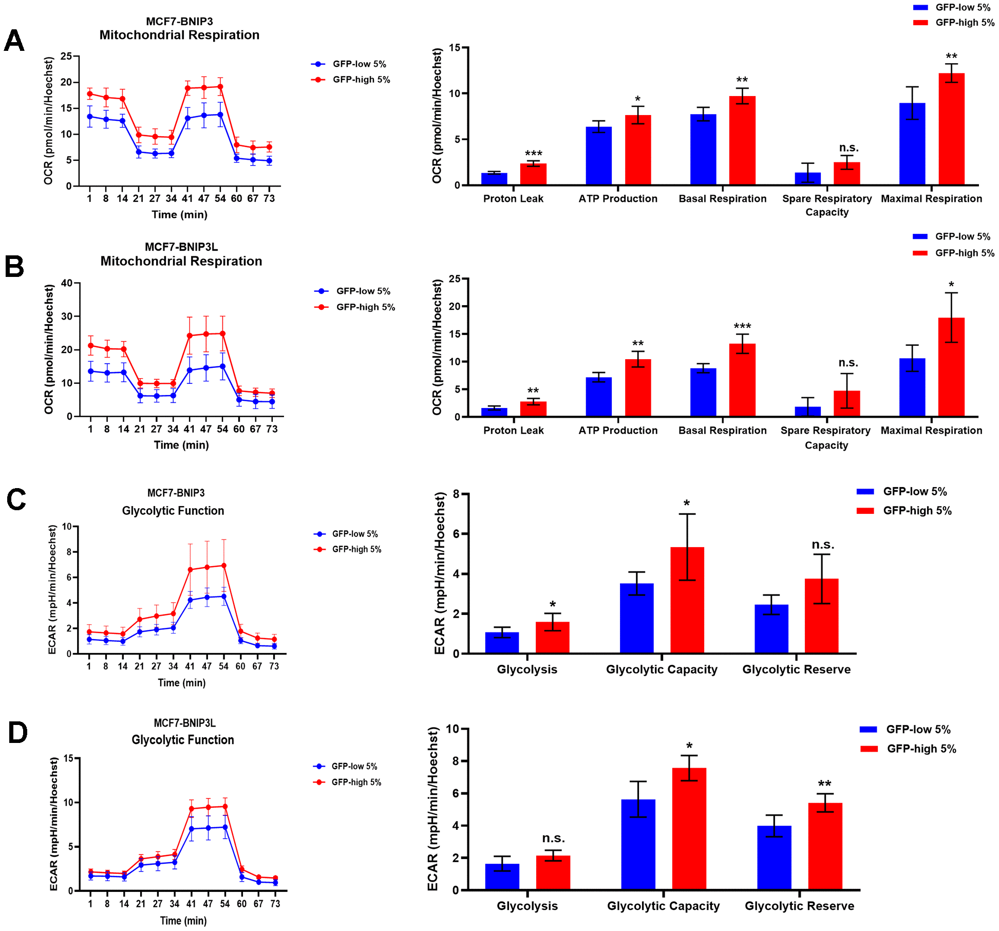 Figure 5. Mitochondrial respiration and glycolysis are significantly enhanced in BNIP3(L)-high MCF7 cells. MCF7 cells stably-transduced with the BNIP3(L)-GFP constructs were subjected to FACS sorting, to isolate the 5% highest GFP (GFP-high) and the 5% lowest GFP (GFP-low) sub-populations. The Seahorse XF96 analyser was employed to assess their mitochondrial and glycolytic function. Mitochondrial function results for BNIP3-GFP cells (A) and BNIP3L-GFP (B) are shown as an OCR tracing in left panel, and bar graphs for proton leak, ATP production, basal respiration, spare respiratory capacity and maximal respiration, obtained from the OCR quantification. Data are shown as the mean ± standard deviation (SD) (n = 5). Statistical significance was determined using an unpaired Student’s t-test, * p ≤ 0.05, ** p ≤ 0.01, *** p ≤ 0.001, n.s. not statistically significant. Glycolytic function results for BNIP3-GFP cells (C) and BNIP3L-GFP (D) are shown as an ECAR tracing in left panel, and bar graphs for glycolysis, glycolytic capacity and glycolytic reserve, obtained from the ECAR quantification. Data are shown as the mean ± standard deviation (SD) (n = 5). Statistical significance was determined using an unpaired Student’s t-test, * p ≤ 0.05, ** p ≤ 0.01, n.s. not statistically significant.